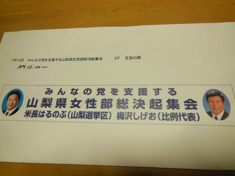 13日.午前10時から.アピオ甲府に於いて「みんなの党を支援する」山梨県女性部総決起集会が、開催されます。今日夕方、看板の下書きの、校正が出来上がりました。ご覧になって下さい。多勢の人の、ご参加を、お待ち致しております。7月11日.撮影 東條初恵