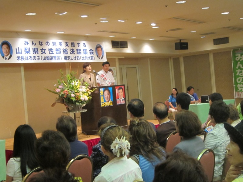 13日.午前10時から.アピオ甲府に於いて、「みんなの党を支援する」山梨県女性部総決起集会が開催されました。写真は、参議院議員.全国比例候補者.梅沢しげお候補者、ご夫人(幸世さまが) レディーファーストで候補より先に、お願いコールもしているところです。中々、会場の支援者へ、真に迫ったお願いが、上手でびっくりしてしまいました。7月13日.撮影 東條初恵