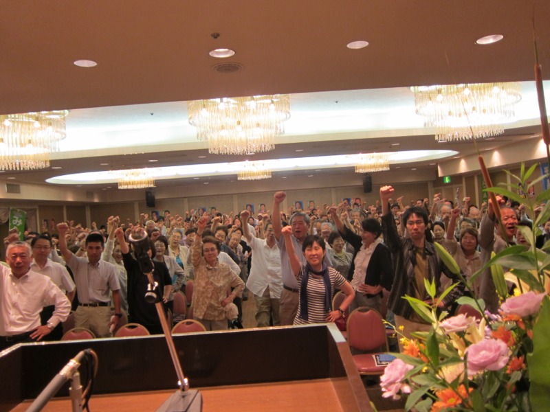 13日.午前10時からアピオ甲府において、「みんなの党」山梨県女性部総決起集会が、開催されました。会場に、イスを何回、追加して出しても間に合わず、結局、立ち見が出てしまいました。シュプレヒコールは、甲府市.市会議員.飯島正樹様.御夫妻によって行われました。本日参集した人たちが、一堂に一気に纏まり、この熱気ある姿をご覧になってください。「みんなの党」は、チームワークが、ガッチリです。勝利に向かって頑張ります。7月13日.撮影 東條初恵