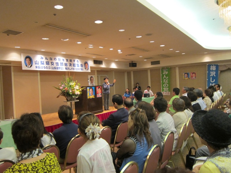 13日.午前10時から、アピオ甲府に於いて.「みんなの党を支援する」山梨県女性部総決起集会は、熱気あふれんばかりの、人、人、人の勢いでした。最後のお礼の挨拶は、衆議院議員.中島克仁事務所の、女性部長.清水祝子さんが、一人ひとりに分かりやすく、選挙当日まで、あと一週間です。一致団結して、このままの勢いで、勝利に向かって頑張り、二人を(米長はるのぶ.梅沢しげお)を、必ず当選させましょうと、力強いお礼と、閉会の挨拶です。さすが元、国語の先生、立派なご挨拶でした。7月14日.撮影 東條初恵