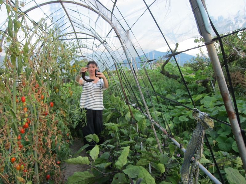 18日.午後6時から、やまなし女性異業種の会の、7月の定例会で中央市の、「なっちゃんの楽園」を、研修しました。ホームページ担当の、中澤由江さんが、大きな茄子(30cm以上)を、採って、びっくりしている所です。ご覧になって下さい。7月19日.撮影 東條初恵
