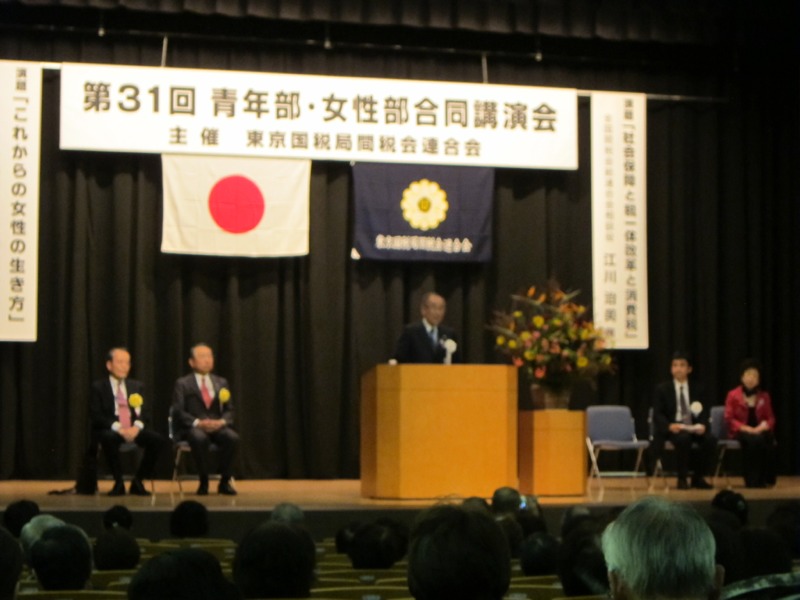 21日.午後1時30分より、東京都千代田区の東商ホールに於いて東京局間連合会の、青年部、女性部合同後援会が、開催されました。写真は、片岡会長のご挨拶です、第一部は、参議院議員の山東昭子さんが、「これからの女性のあり方」第二部は、全国間税会総連合会相談役の、江川治美氏が、「社会保障と、一体改革と消費税」について、講演されました。10月21日.撮影 東條初恵