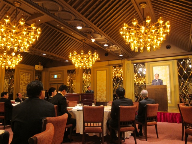 11日.午後6時から、甲府古名屋ホテルに於いて、「信芽会」第二回目の学習会を開催しました。写真は、金丸康信会長がご挨拶をしているところです。学習会の前半は、みずほ総合研究所政策調査部の、岡田豊氏の、人口減少時代の、地域活性化のあり方と題してお話をお聞きしました。後半は元、日銀甲府支店の支店長が、これからの、1日本経済について、1) 日本の人口動態、2) 需要構造の変化、3) 税理論の転換、4) 日本の風土、文化に根ざした経済社会の構築等を、話されました。11月11日.撮影 東條初恵