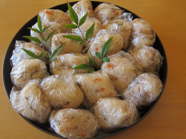 12日.お昼ご飯に間に合うように、〜グループホーム〜「アルプスの なかまたち」の工事現場へ、「野菜のおこわ」を、現場監督に、差し入れしてきました。おにぎりの中身は、もち米と、ごぼう、人参、鶏肉、小さな煮干し、セロリ、さつま揚げ等です。現場の職人たちに、大変喜ばれました。12月12日.撮影 東條初恵