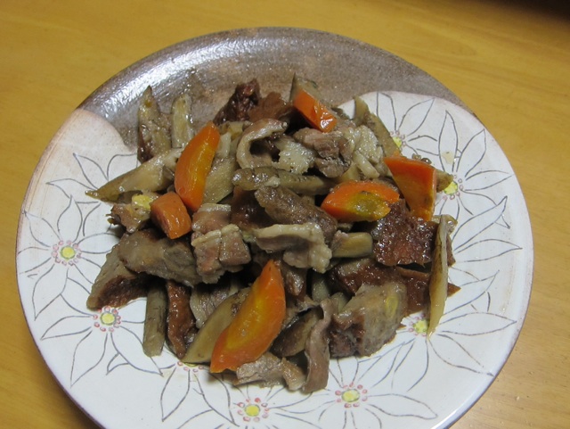 12日.Akiko'Tojoが、朝からゴボウを、綺麗に洗ってくれました。洗ったゴボウを「野菜おこわ」に、入れて、ご飯を炊いた後の、残ったゴボウは、人参と、さつま揚げと、豚肉を、一緒に圧力鍋で煮込みました。とっても、おいしく炊きました。ご覧になって下さい。12月12日.撮影 東條初恵