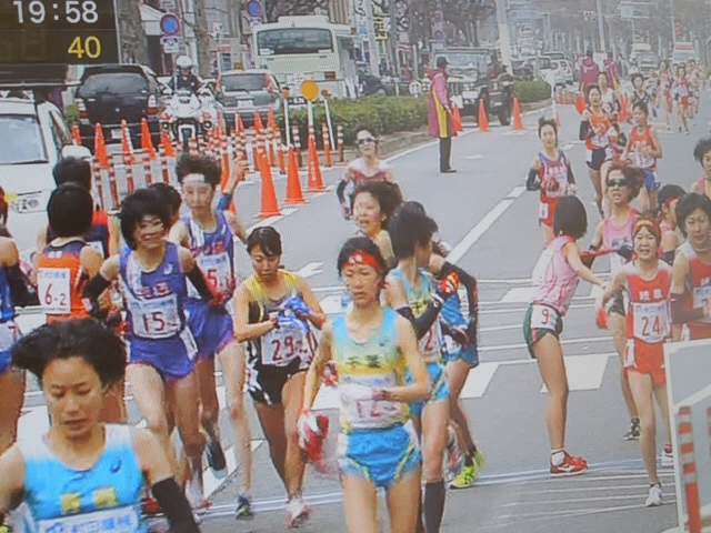 12日.正午スタート、第32回、都道府県対抗全国女子駅伝大会が、京都で開催され、京都チームが、優勝しました。左側の15番のゼッケンが、山梨県代表選手です。1区から→2区の走者にタスキを渡しているところです。山梨県の、今年の総合順位は、20位で(過去最高記録)した。今から30年前に私も、この大会へ36歳で、第一回大会、第二回大会と、連続出場をし、5区の国際会館前を走りましたので、今日はテレビの前で、釘付けとなり応援しました。1月12日.撮影 東條初恵