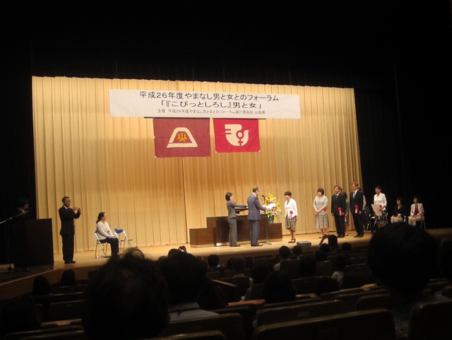 15日.午後1時半から、甲府市総合市民会館に於いて、平成26年やまなし男と女とのフォーラムで、山梨県男女共同参画推進事業者の表彰式を開催しました。山梨県横内知事より「県民表彰」4名と「事業者表彰」3事業者が、表彰されている写真です。やまなし女性異業種の会からも、4名が出席し、1名(三森がおり)さんが、会場をマイクを持って、飛び回っていました。このフォーラムは、年々、出席者数が少なく、年配者が多くなってきたような気がいたしました。6月15日.撮影 東條初恵
