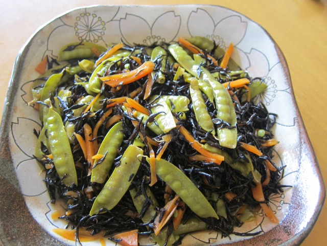 2日、我が家の菜園から、一邦さんが、朝5時.早朝に採った.「さやえんどう豆」と、「ヒジキ」と、「人参」を一緒に煮付けて、昼食に間にあいました。ご覧になって下さい。6月2日.撮影 東條初恵