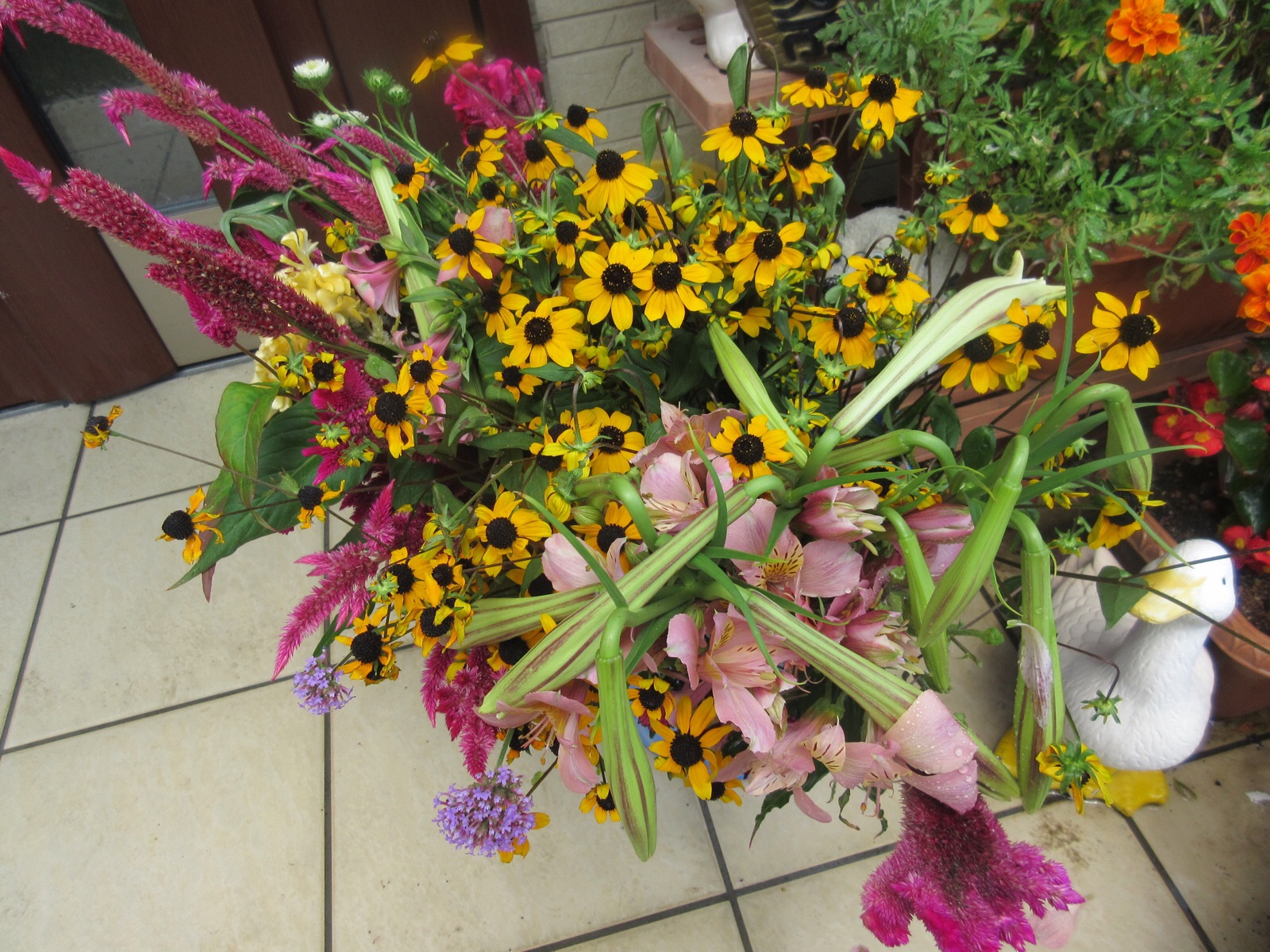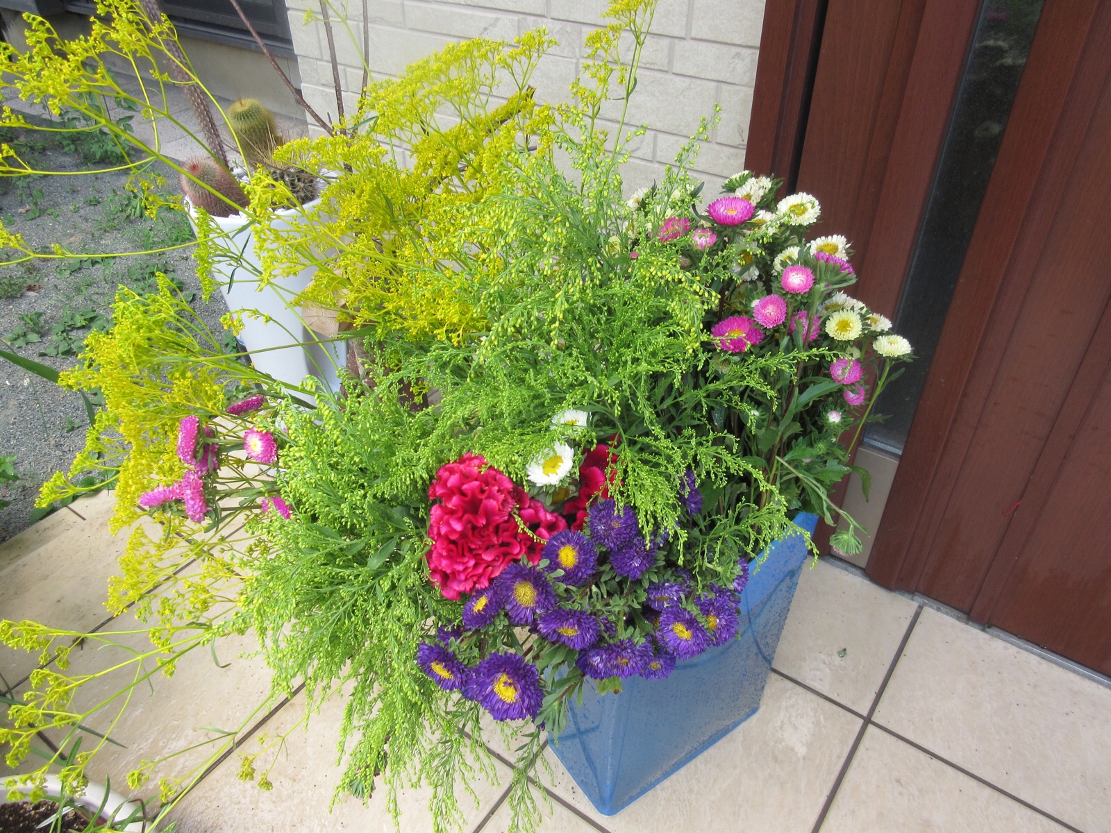 14日.お盆のお花を、中央市にお住まいの「なっちゃんの楽園」の、内藤初三さんが育てたお花を、沢山いただきました。玄関にいっぱい飾り賑やかになりました。8月14日.撮影 東條初恵