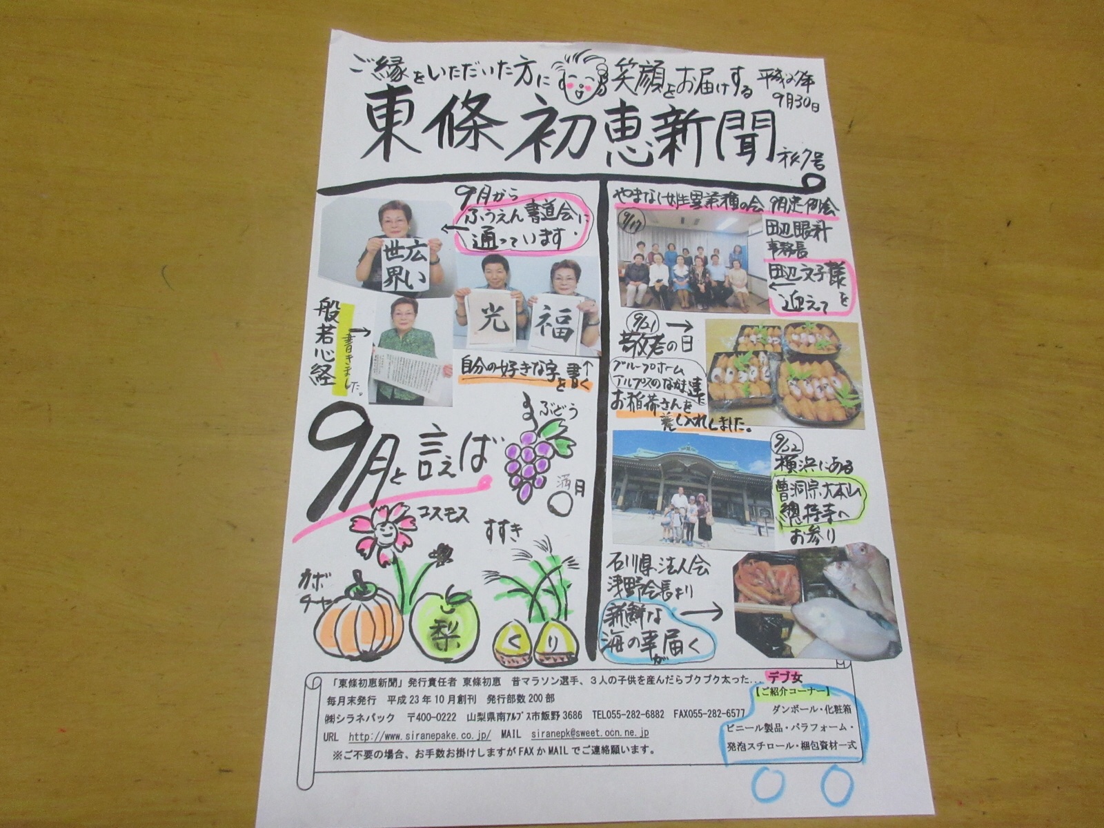 ご縁いただいた方に、毎月、笑顔をお届けする新聞「東條初恵新聞」9月号を発行しました。すでに郵送してあり、ご縁をいただいた方の、お手元に届いていると思いますが、ご覧になって下さい。10月7日.撮影 東條初恵