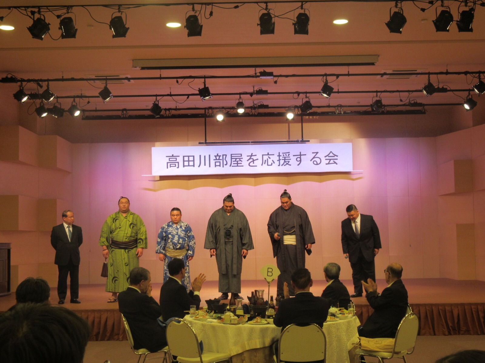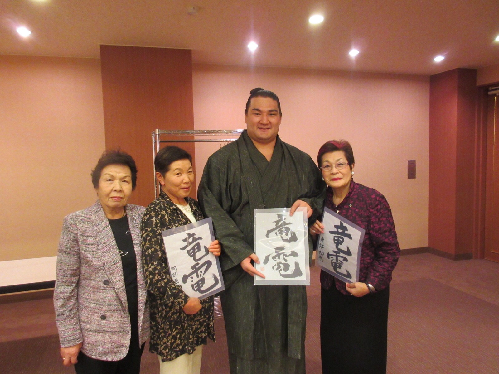 10日.午後6時から→ジットプラザ甲府に於いて、お相撲の「高田川部屋を応援する会」が、開催されました。このたび、秋巡業で「大相撲、富士山山梨場所が」開催されることを受け、高田川親方を初め、山梨出身の幕下「竜電」他3人の力士と県内財界の皆様との交流会を開催しました。「竜電」と、筆で書いた名前を、本人に手渡しをして、とても喜ばれました。ふうえん書道会の、安田玄延先生の書いた字と、私の書いた字と、阿部亜紀子さんの書いた字を、プレゼントしました。ご覧になってください。10月10日.撮影 東條初恵