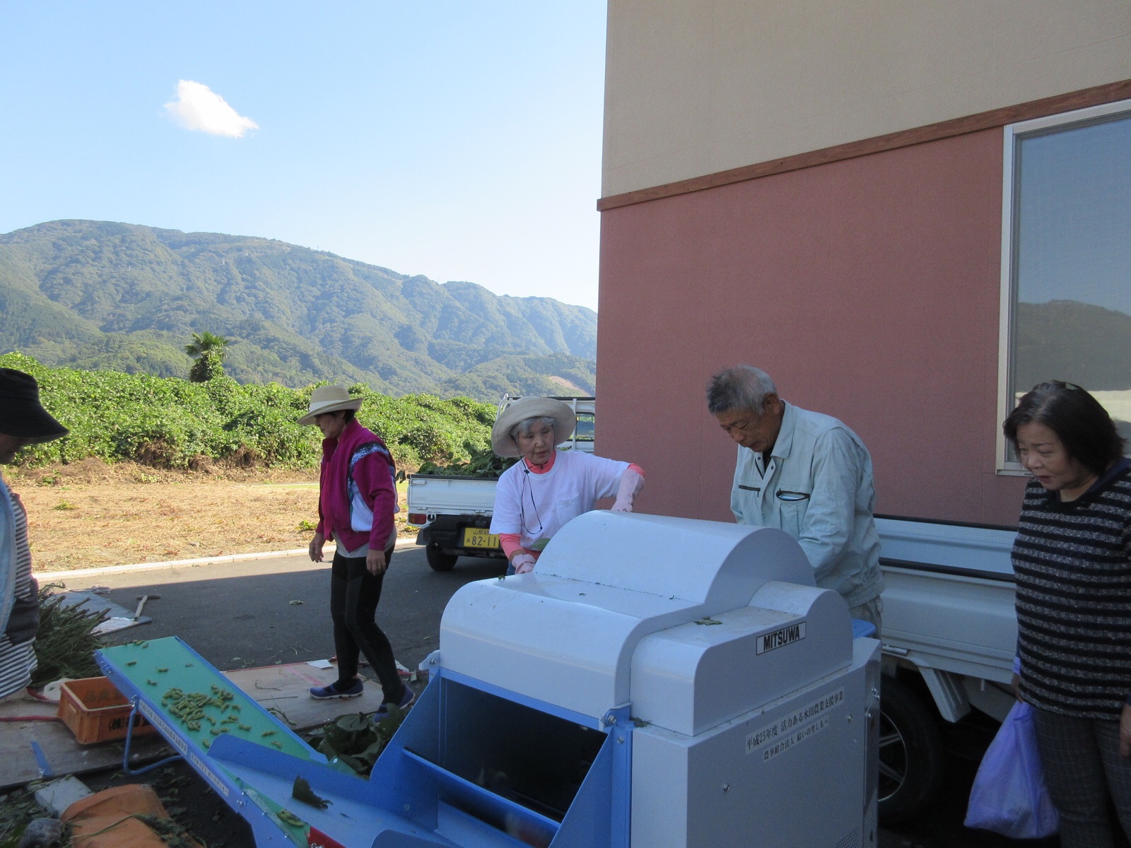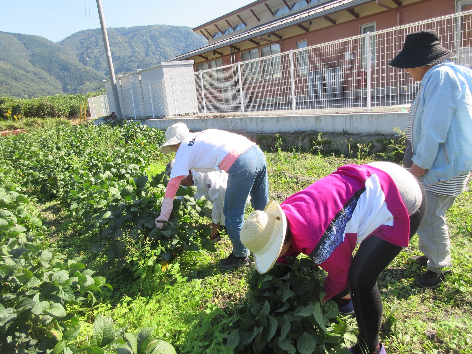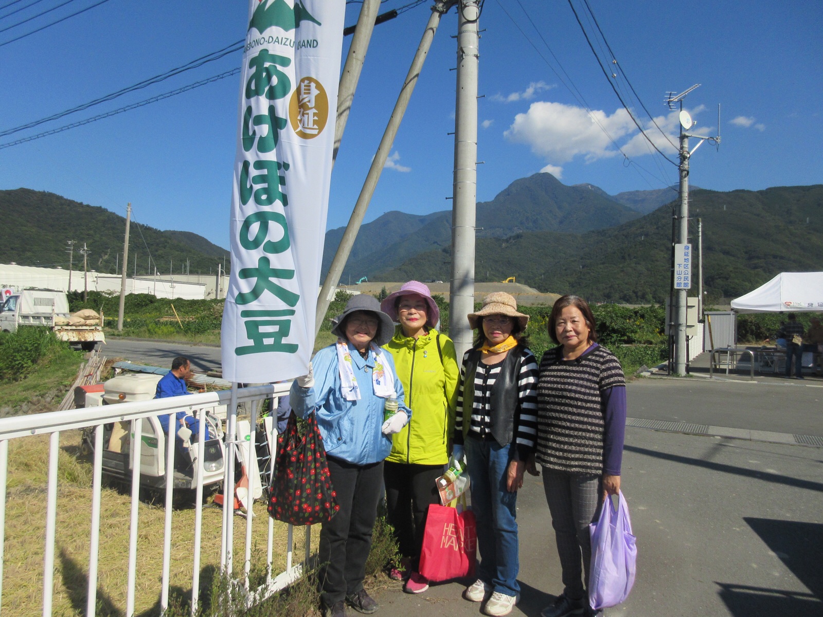 15日.お昼を食べてから、近所の奥さん達と一緒に、身延山の近くの、下山小学校の北側へ、曙大豆のオーナー制 (産地フェア)の→収穫に行ってきました。身延町内の8会場で「枝豆の収穫体験」を開催しています。枝豆の木から、一つ一つ粒を切り落とす作業かと思って、ハサミや軍手ビニール袋を用意して行きましたけど、今では文明が進んでいて、取った枝豆を機械にかけると、オートメーションで、枝豆と葉っぱと木が、別々に分かれて出てきました。これはビックリでした。県庁を退職した佐野和彦さんが、「枝豆フェアーの先頭」に、立って活躍していました。ご覧になってください。 10月15日.撮影 東條初恵
