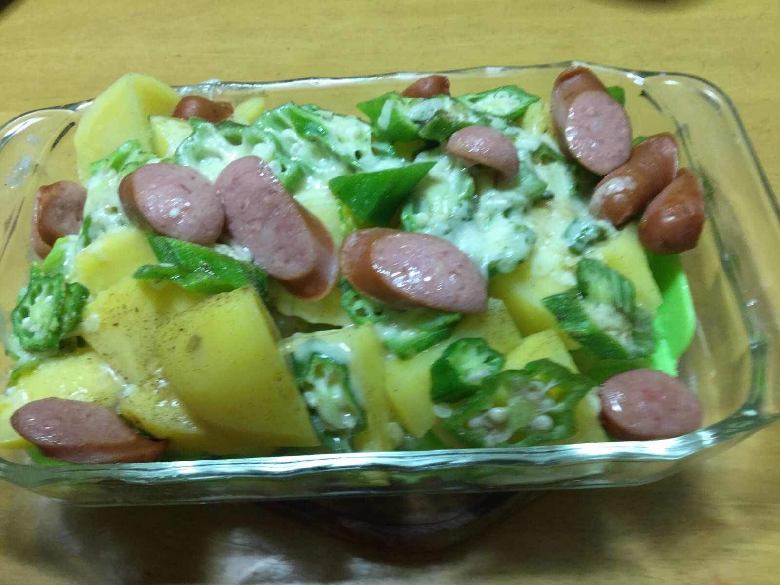 じゃがいも(岐阜県中津川産)に→我が家の「家庭菜園」で、採れた(オクラ)の上に、ウインナーソーセージと.溶けるチーズを、乗せました。「ホクホクじゃがいも」と、オクラに、チーズとウインナーが、マッチして、最高の味の仕上がりです。ご覧になってください。 10月14日.撮影 東條初恵