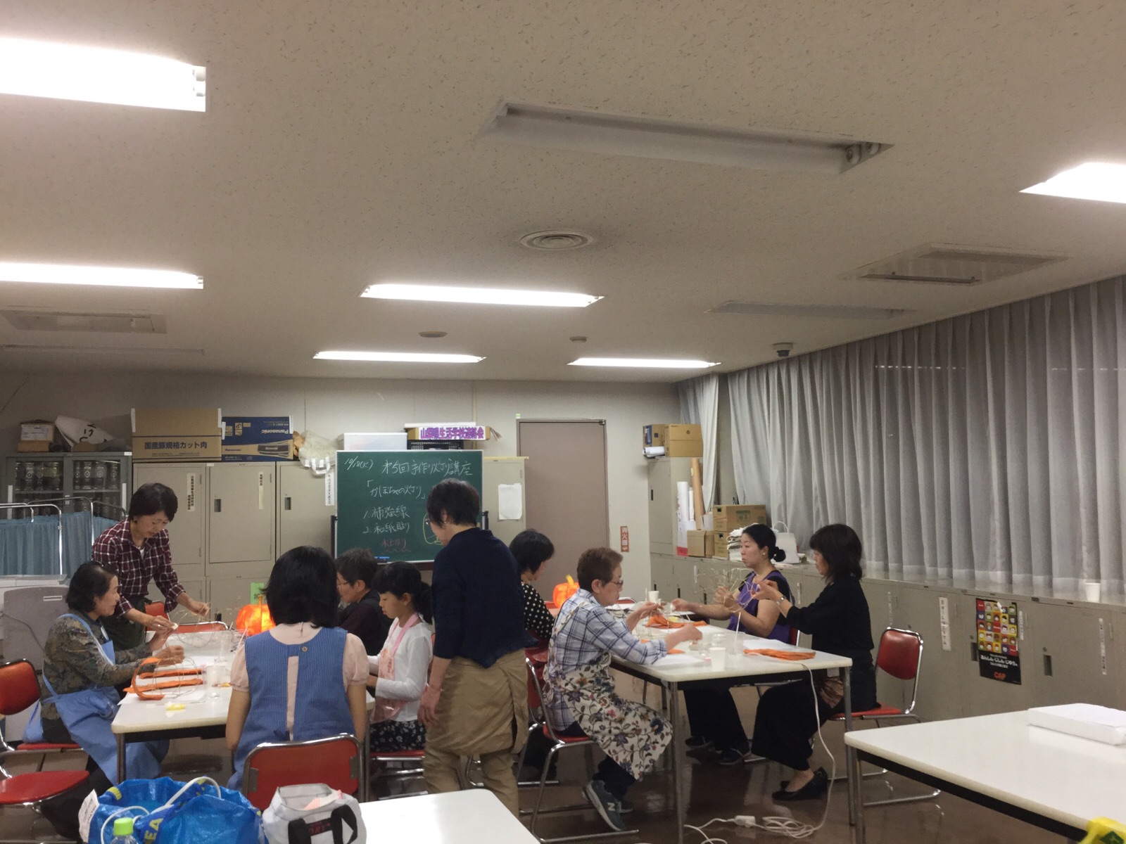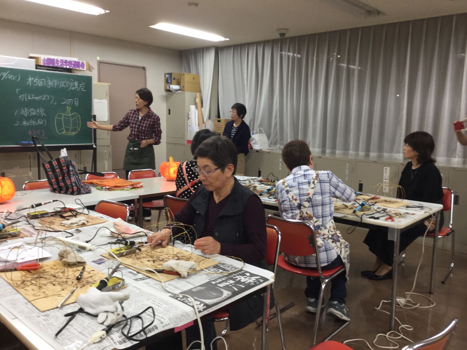18日.やまなし女性異業種の会、10月の定例会では、今年度の事業として始めた灯り作りに、取り組んでいます。今回で5回目です。講師の先生は、笛吹市に春日居町に住む、「庵Lys'主宰」→生原きみほ先生です。カボチャは、今回で2回目です、来月3回目で完成品になりますが、今晩は骨組みと、和紙を半分貼った所で終了でした。来月3回目が楽しみです。会員が作っている様子を、ご覧になってください。 10月18日.撮影 東條初恵