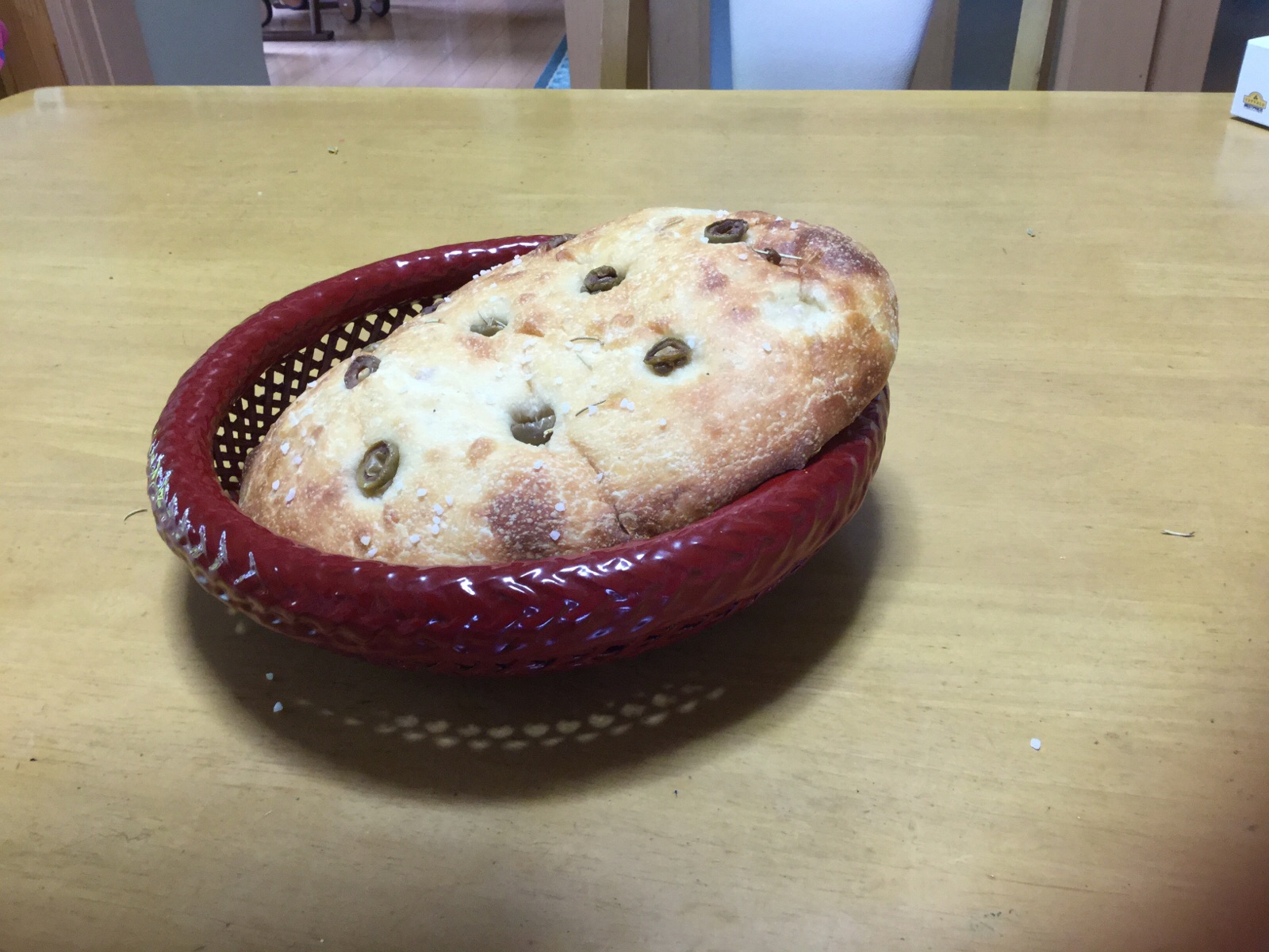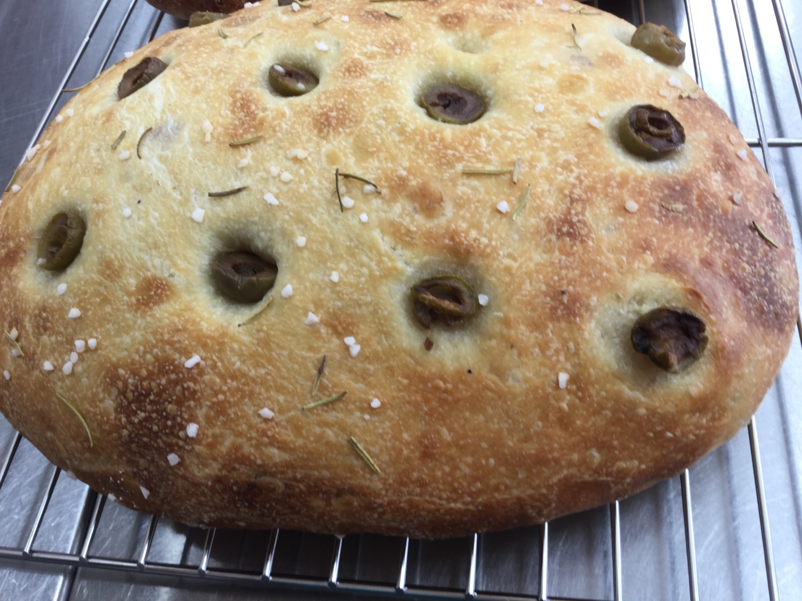 手作りパン教室(アトリエ・ウィークエンド 福田由香里先生のご指導で→「天然酵母ポテトフォカッチャ」中には→ジャガイモとベーコン、塩胡椒、フライドオニオンが入った、大きなパンを作りました。焼き上がった表面にのっているのは、オリーブの実と、ローズマリーなどのドライハーブと岩塩を乗せて焼き上げました。ご覧になって下さい。 10月19日.撮影 東條初恵