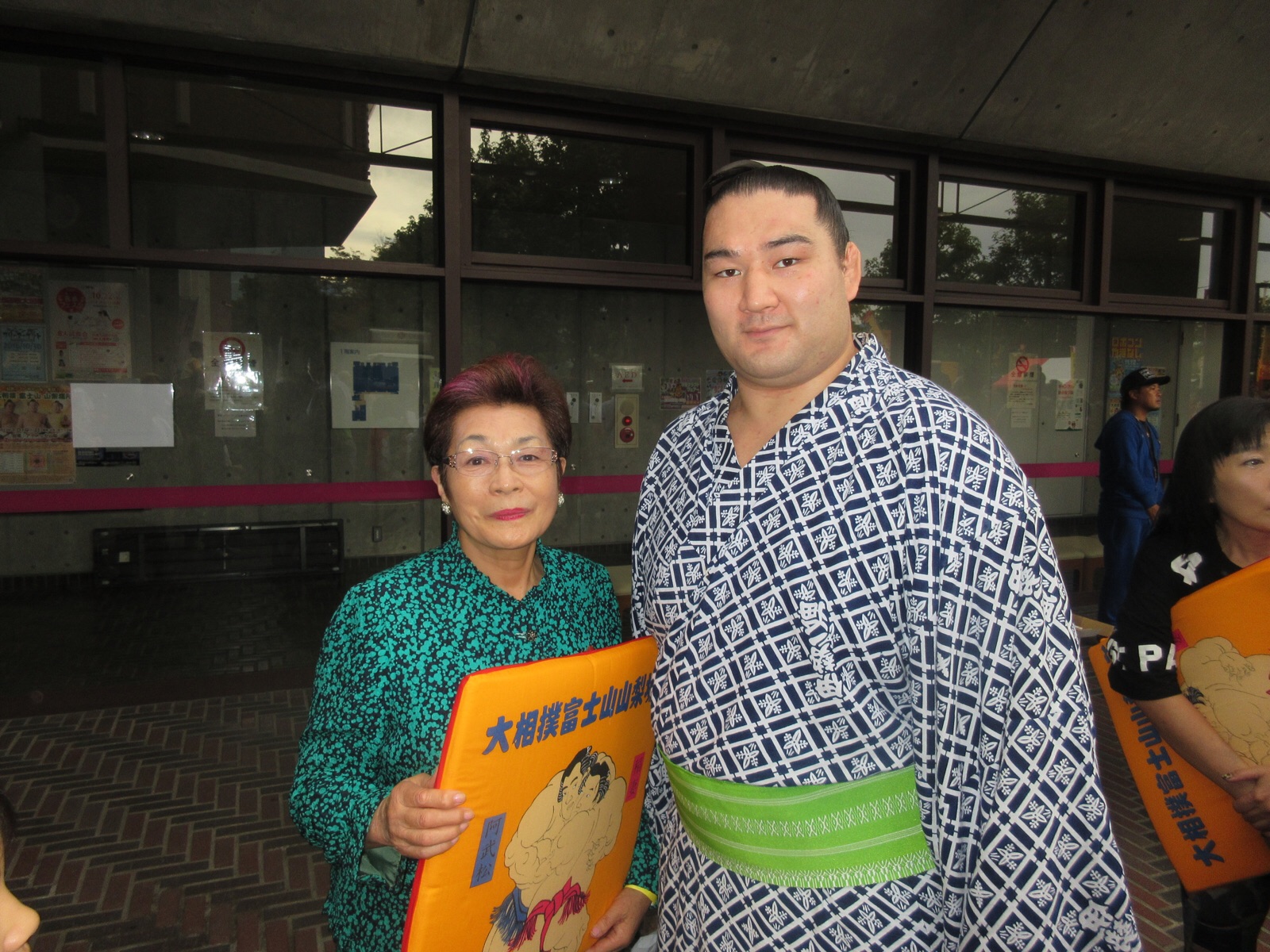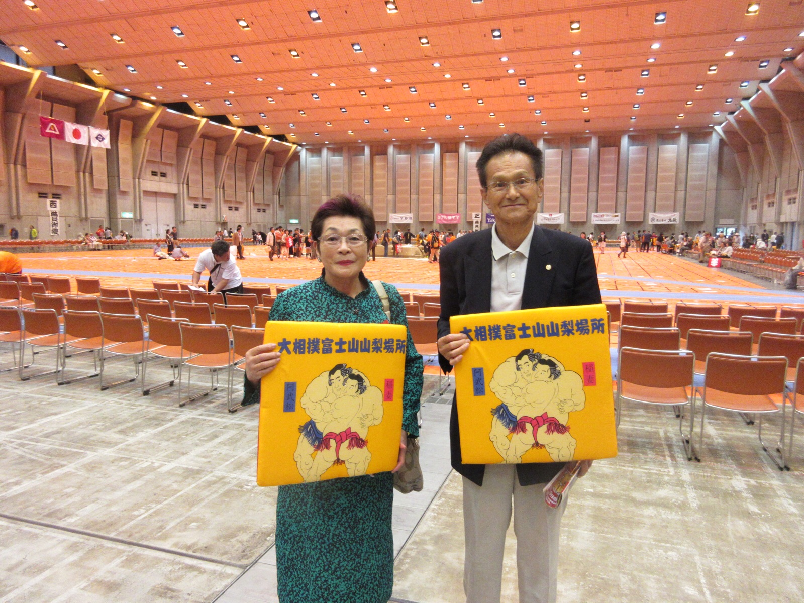 9日.アイメッセで行われた、大相撲→富士山.山梨場所で、帰りに一邦さんと座布団を1枚ずつ、いただいてきました。私は、山梨県出身力士、竜電と一緒に写真を撮ってもらいました。竜電が、十両に昇進したため、10月27日(木曜日)18時30分より.甲府市高畑にある、ジット甲府プラザに於いて、祝賀会が開催されます。会費は1人1万円です。参加される方は、お電話(09030879307)ください。 10月11日.撮影 東條初恵