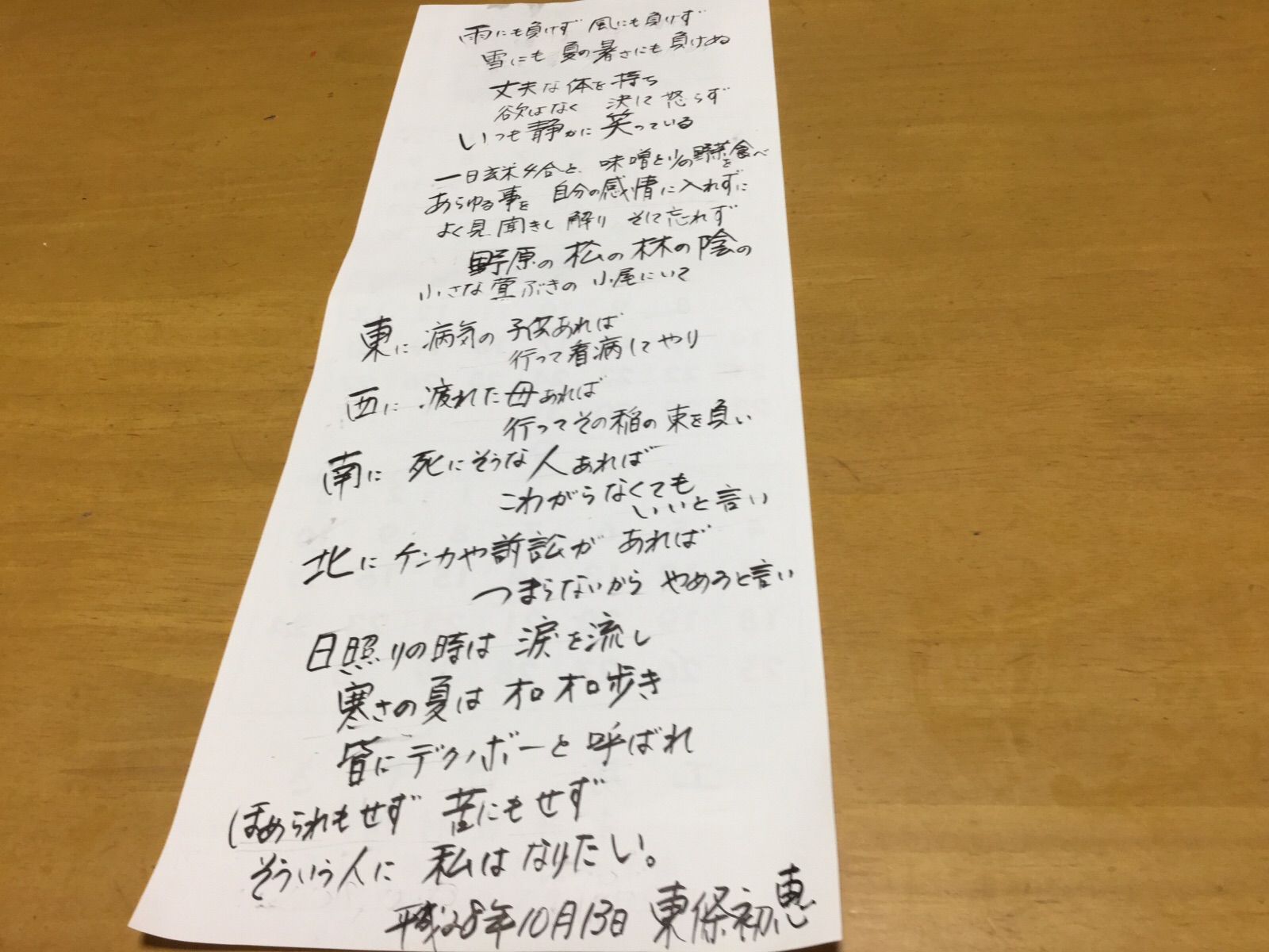 13日.夜9時30分.時間があったので、お香を焚きながら、筆ペンを、持ってみました。上手には書けませんが、3ヶ月続きのカレンダーの裏に書きました、廊下にでも貼って、毎日、何回か、読んでみたいと思っています。ご覧になってください。 10月13日.撮影 東條初恵