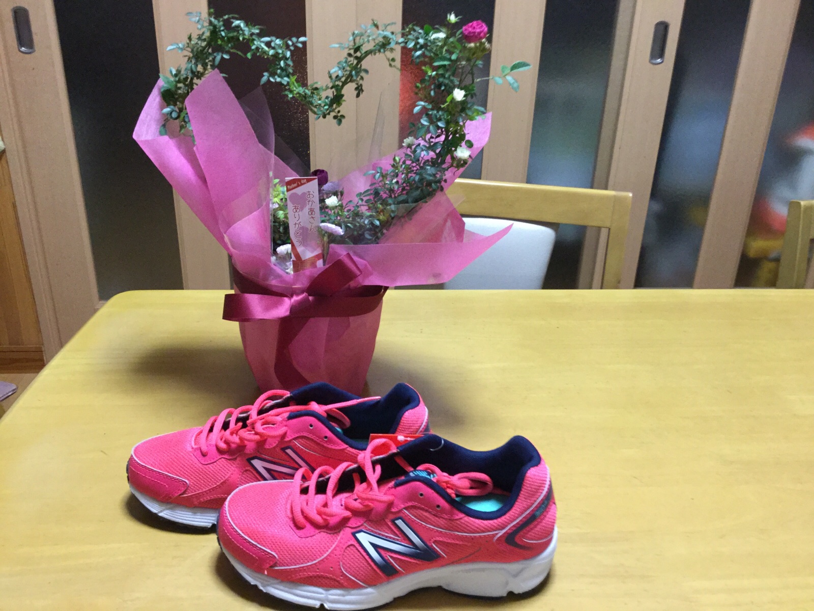 14日.次女Akikoさんから、母の日プレゼントいただきました。Akikoさんは、4月6日に次男を出産したばかりですので、私が毎日、赤ちゃんのお手伝いをしているからか、私の大好きなピンク色の、シューズと、ハートのバラの花をいただきました、長男からは、エステのマッサージ券を、沢山いただきました。ご覧になってください。平成29年5月14日(母の日)撮影 東條初恵