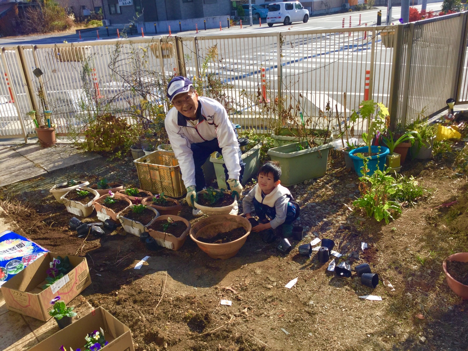 フェンスにつるす、冬の花→パンジーを、一邦さんと、3歳の孫2人で植え替え作業をしてくれました。ご覧になってください。平成29年12月5日、撮影 東條初恵