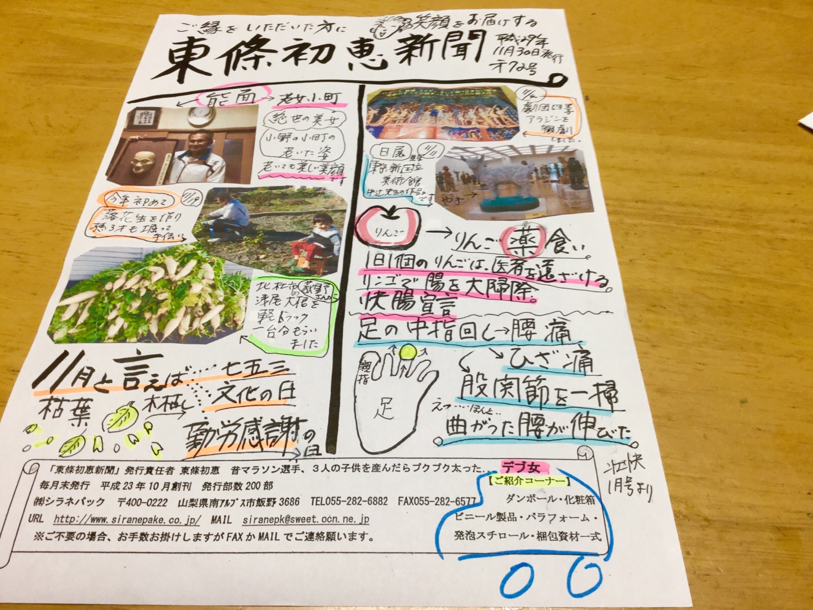 東條初恵新聞→11月号を、発行し郵送しました。ご覧になって下さい。平成29年12月7日、撮影 東條初恵