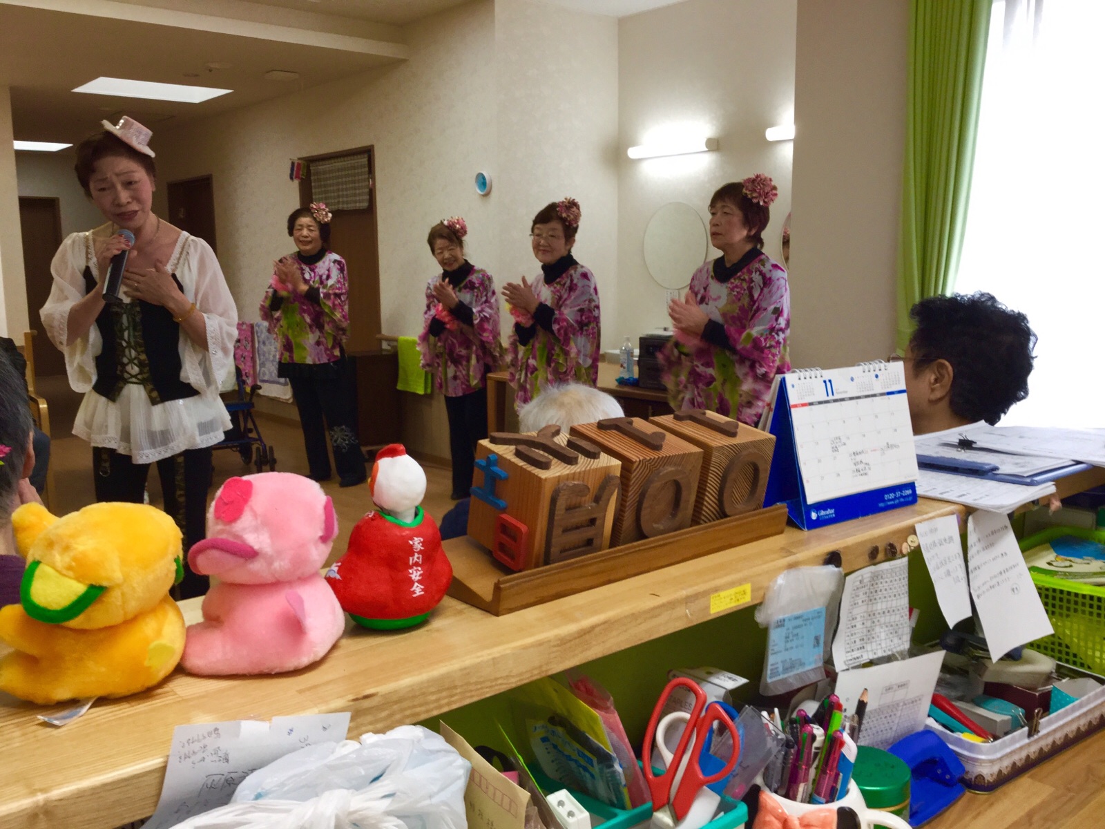 グループホーム「アルプスのなかまたち」に、市内に住む、歌謡集団が来て、ボランティアで歌を歌ったり→沢山の踊りを踊ったりして.入居者を、楽しく喜ばせてくれました。ご覧になってください平成29年12月1日、撮影 東條初恵