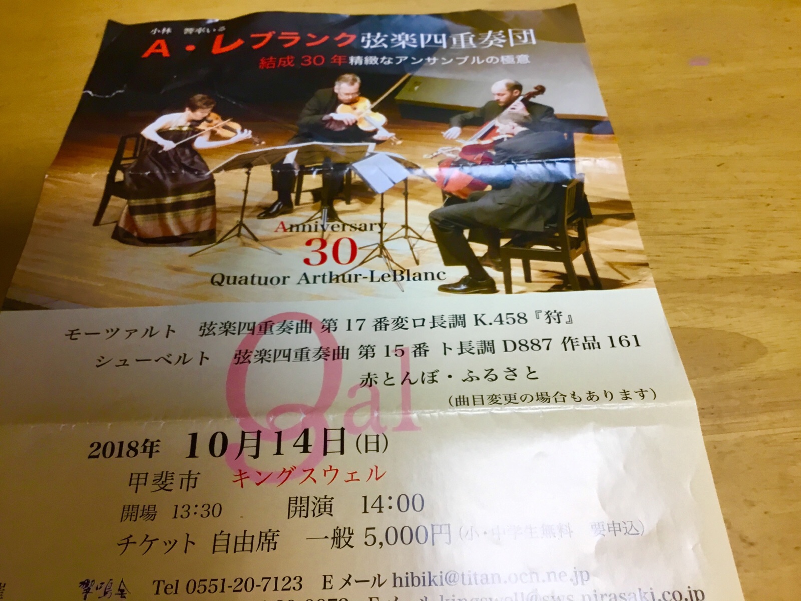 14日.午後14時から、甲斐市のキングスウェルに於いて、A.レブランク弦楽四重奏団の演奏で、モーツアルトの第17番変ロ長調K.458「狩」シューベルト、第15番 ト長調D887作品161を聴いてきました。小林 響さんは、2歳からヴァイオリンを始め14才で、イスラエルフィルに感銘し単身で、イスラエルに留学したと言う、素晴らしい奏者の弦楽四重奏団に、引き込まれた演奏でした。ご覧になって下さい。平成30年10月14日.撮影 東條初恵