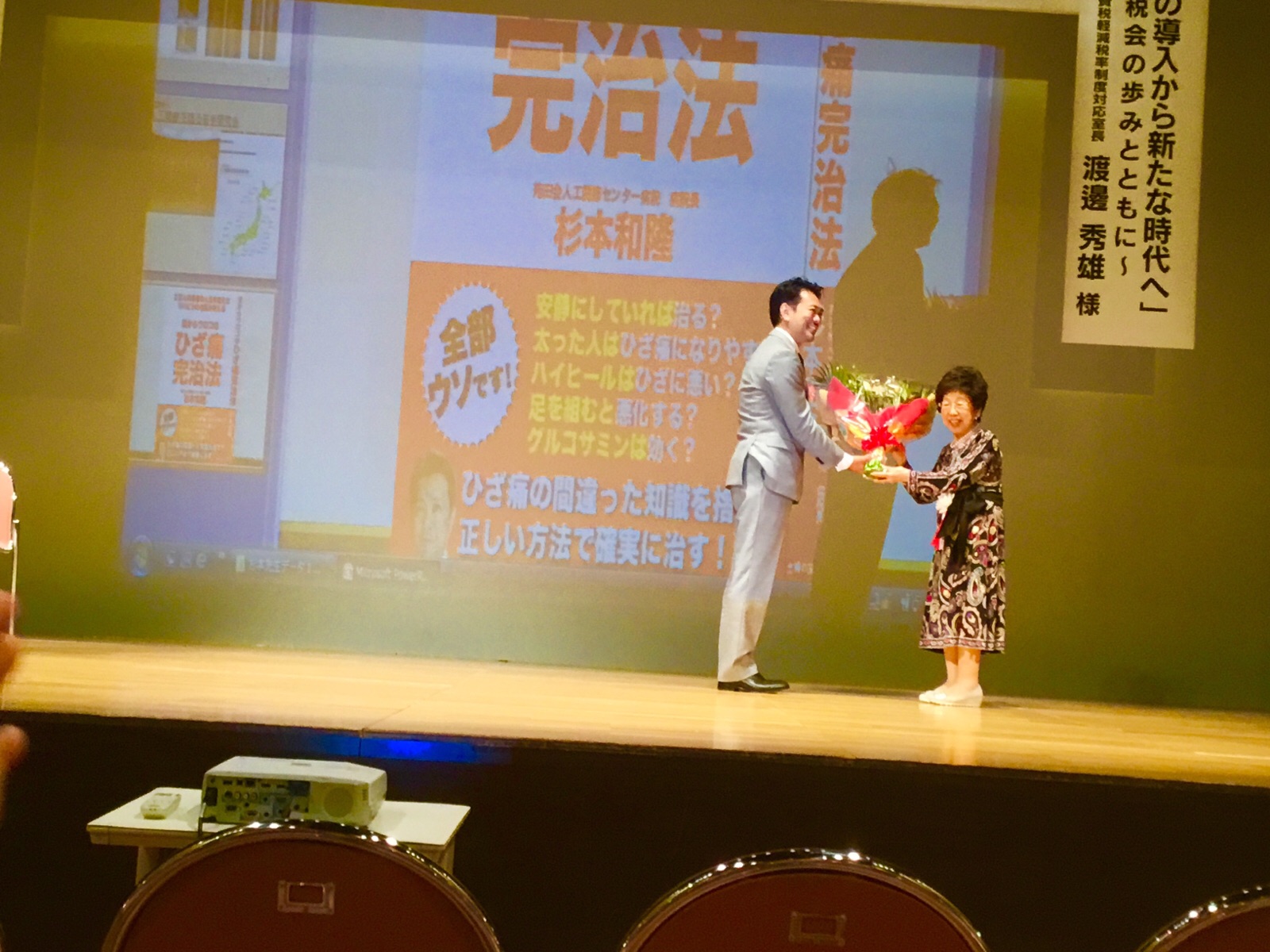 3日.13時30分より、東京国税局連合会→青年部.女性部合同講演会が開会されました。午前9時30分に家を出て、中央自動車高速を走らせ出席してきました。講演会の内容は、第1部では、東京国税局→消費税軽減税率制度対応室長の渡邊秀雄氏が、「消費税の導入から 新たな時代へ」と、第2部では、苑田会→人工関節センター病院長の杉本和隆氏には、「生きること 、歩むこと」と題して、お話をお聞きしました。講演会終了後、白川よし子女性部長が、にこやかに笑って、花束贈呈を致しました、ご覧になって下さい。