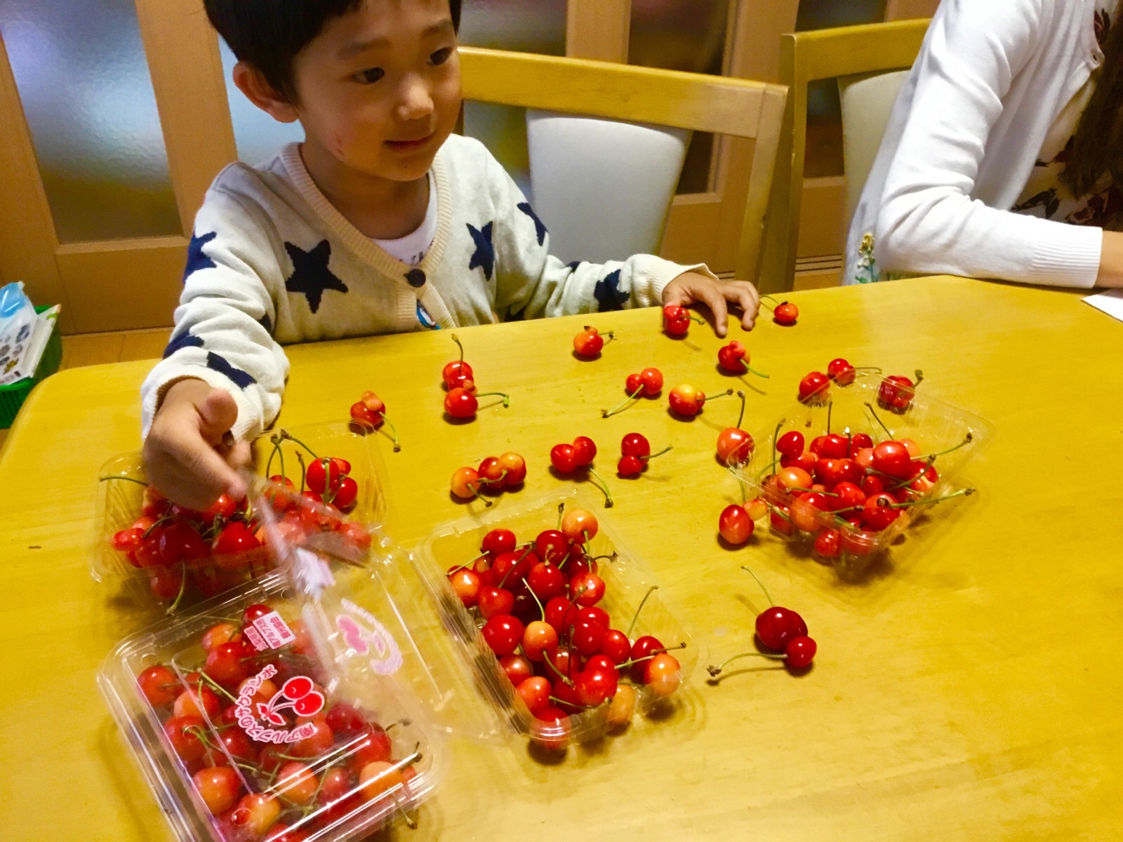 8日.ママがサクランボを、買って来てくれました。孫5歳は、大喜びで、サクランボ並べて数えていました。ご覧になって下さい。令和元年6月8日、撮影 東條初恵