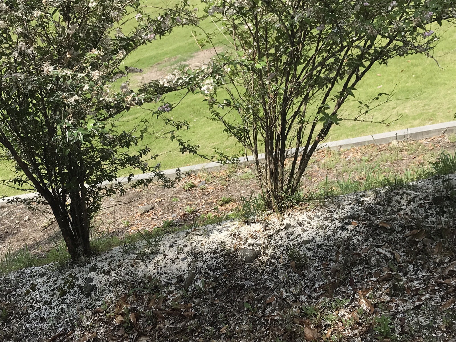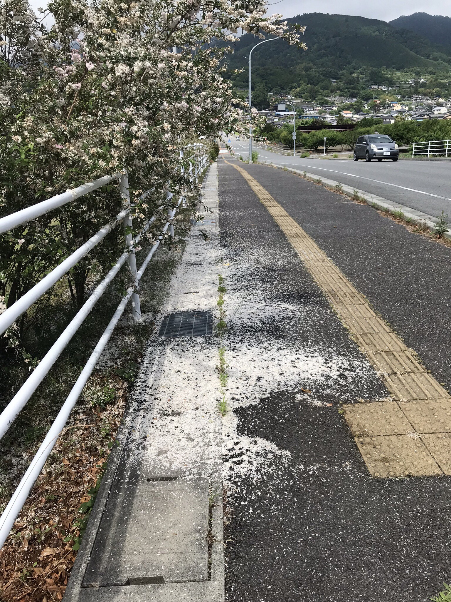 9日.公園を、早朝ウォーキングしていると、昨日まで真っ白く綺麗に、満開に咲いてた花が、一夜明けたら、路面に真っ白く雪の様に、落ちていてビックリしました、たった今まで綺麗に咲いていたんだと言う、歴然とした痕跡が残されて、花の命の儚さが伝わってきました。令和元年6月9日、撮影 東條初恵