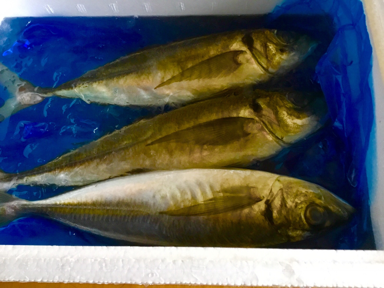 岩手県大船渡市の産直センターから、獲りたて→新鮮な海産物が届きました。新鮮な大きなアジ3匹と、サバの半身3個と、塩ウニと、塩蔵ワカメです。ご覧になって下さい。令和元年11月5日、撮影 東條初恵