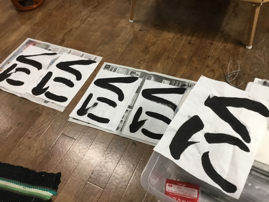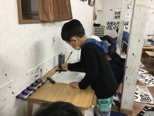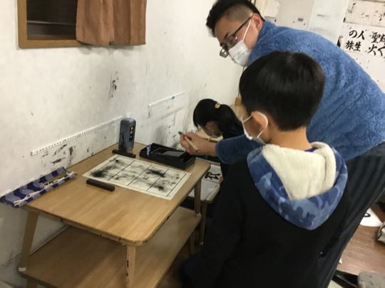 27日、17時.孫5才(年中さん)が、甲斐市の「かおり幼稚園」から帰ってきてから、雪の降る中→ふうえん書道会(塾)に、行ってきました、2月2日のサンニチ席書大会に向けて.一生懸命に、安田先生と私も一緒に頑張っています。