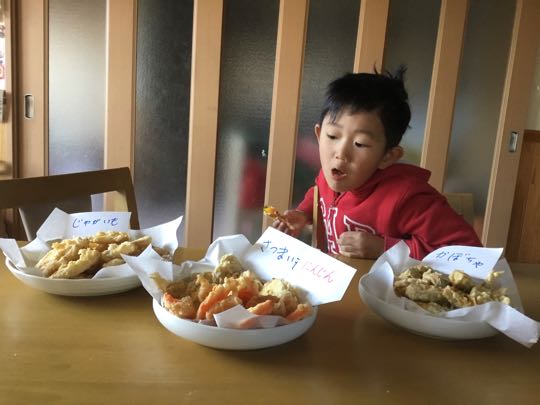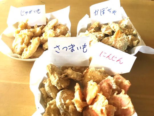 孫5才が、幼稚園から帰って来るまでに、4種類の天ぷらを、作っておきました、1) かぼちゃ、2) じゃがいも、3) さつまいも、4) にんじん、全部 ひらがなで.立て札を立てておきました、帰って来て早々に、大きな声で~ひらがなを読み上げていました。カバンを投げる様に置き、すぐ「天ぷら」を、食べていました。ご覧になって下さい。