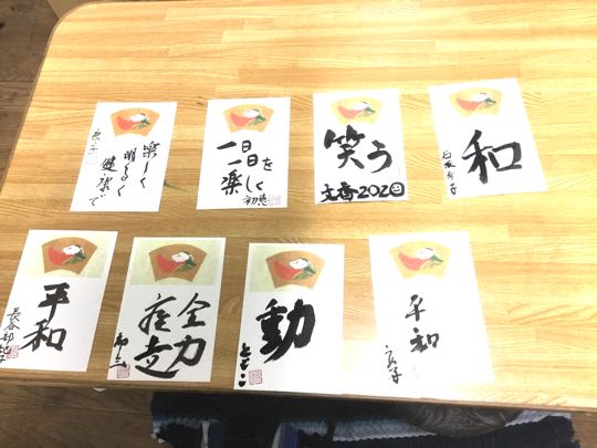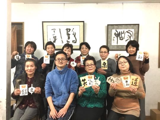 28日. 19時30分から、やまなし女性異業種の会では、1月の定例会として、南アルプス市にある、ふうえん書道会(塾)に於いて、会員が一堂に集まり、安田篤史先生のご指導で、みんなで「書初め」を書きました。正月らしく、タコやコマに、今年の想いを書きました。ご覧になって下さい。