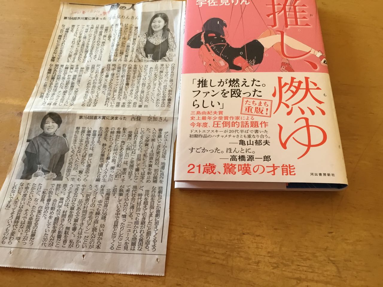 21日.山梨県の今朝の山日新聞に、芥川賞と直木賞を、受賞した、2人が「時の人」で、載っていました、ので、早々に、午前10時、TSUTAYAの開くの待って、芥川賞と直木賞の本を買いに行ってきましたが、やっと見つけて、「推し燃ゆ」が一冊しかありませんでした。