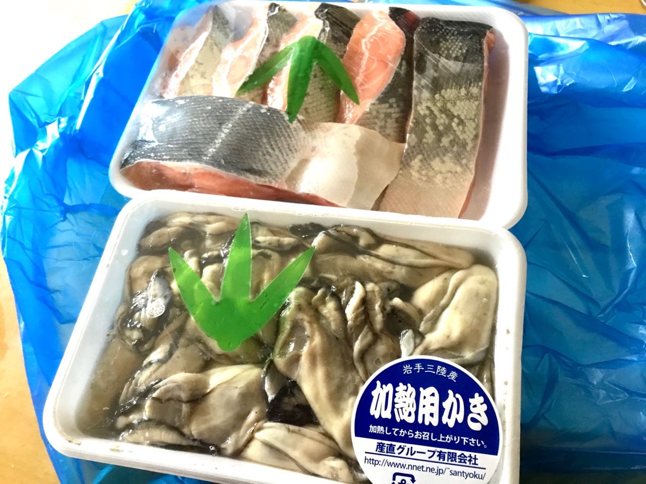 15日.岩手県大船渡市の産直グループから、三陸海岸でとれた、新鮮なお魚(真ますの切り身と、大きな牡蠣の剥き身)→かが届きました、早々にお昼に焼いて食べましたが、ますの切り身が→脂がのっていて.その美味しいこと→美味しいこと.お魚ってこんなに、美味しかったっけと思うほど、美味しくいただきました、ご覧になって下さい。