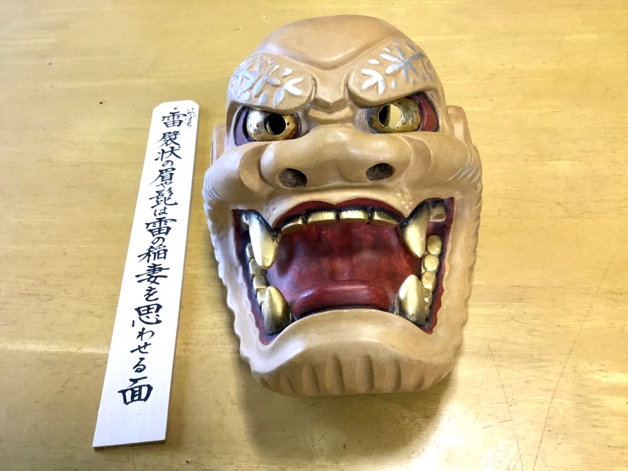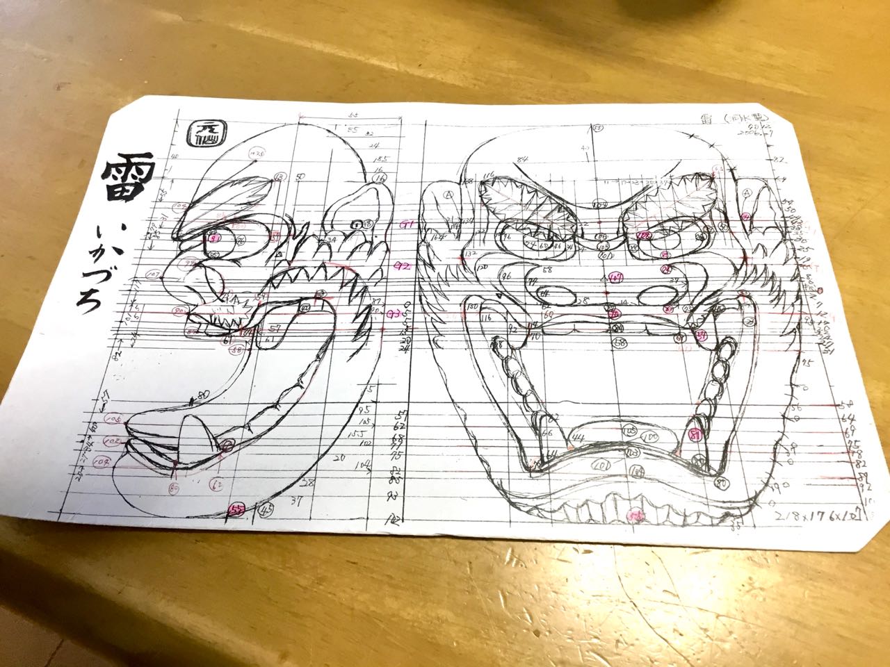 20日.一邦さんが工房から、抱き抱えるように、大切に能面を持ってきて、私に見せてくれました、かなり長い時間と、手が、かかっているそうです、図面を見て、その細かさが、シッカリと伝わってきました→襞(ひだ)状の眉や髭(ひげ)は、雷のいなずまを思わせる面です。どうぞ、ゆっくりと、ご覧になって下さい、