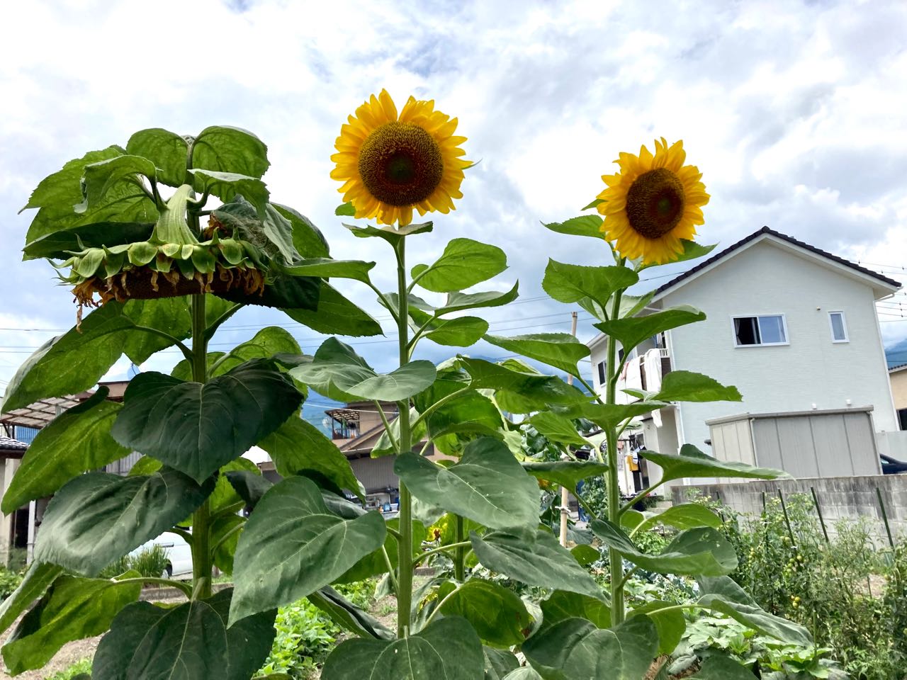 14日.我が家の裏庭にある、畑に、去年の種が、こぼれて、自然に咲いた、ひまわりが、今年は3本咲きましたが、一番大きな、ひまわりは、すでに咲いてしまい、今、2本のひまわりが、満開で~~す。ご覧になって下さい、
