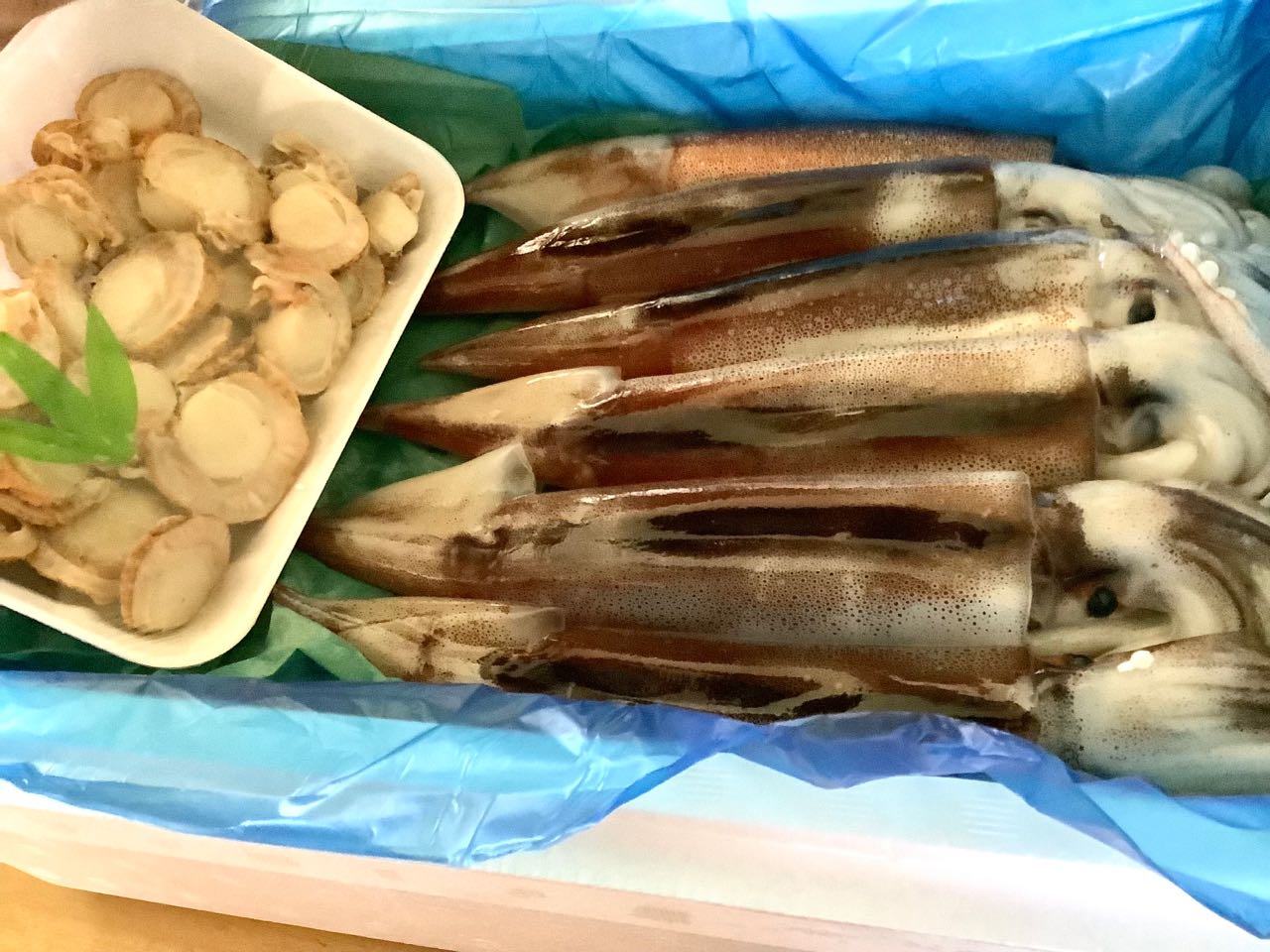 22日.午後、岩手県大船渡市から新鮮な、(取り立て、裂きたて、作りたて)の、お魚が、届きました、1)真イカ 2)ベビーボイル.ホタテ、3)トビウオ、でした、