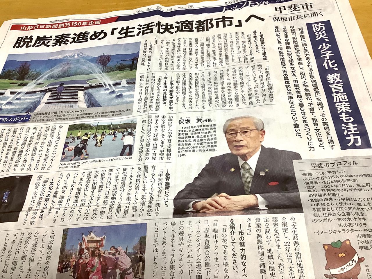 18日.山日新聞に、甲斐市の保坂武市長が、22面に、一面に載っていました、「脱炭素生活快適都市」へ、まだ、ご覧にになって、ない方は→立派な市長を、ぜひご覧になってください、