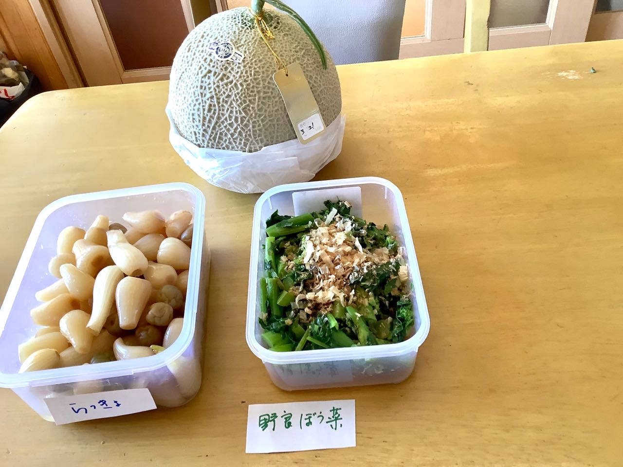 20日.朝、一邦さんが畑から、「野良ぼー菜」を、沢山取って来たので、同級生で近くに住む、飯田電設の社長の所に、お届けしたら、おや.まぁー、、こんなに大きな→静岡県の大きな「メロン」を頂いて来ました、私も早速.「野良ぼー菜」を、湯がいて、早々に.カラシ醤油を作って調味料とおかかを載せて、お昼ご飯の支度をしておきました、らっきょう.は、血液の流れを良くするために、一日3個づつ、毎日、食べています、五月には、新しいラッキョウを、1年分漬けるため、昨年、漬けたラッキョウが、まだまだ2階の冷蔵庫に山ほど、残っていますので、せっせと、食べようと思っています、ご覧になって下さい、
