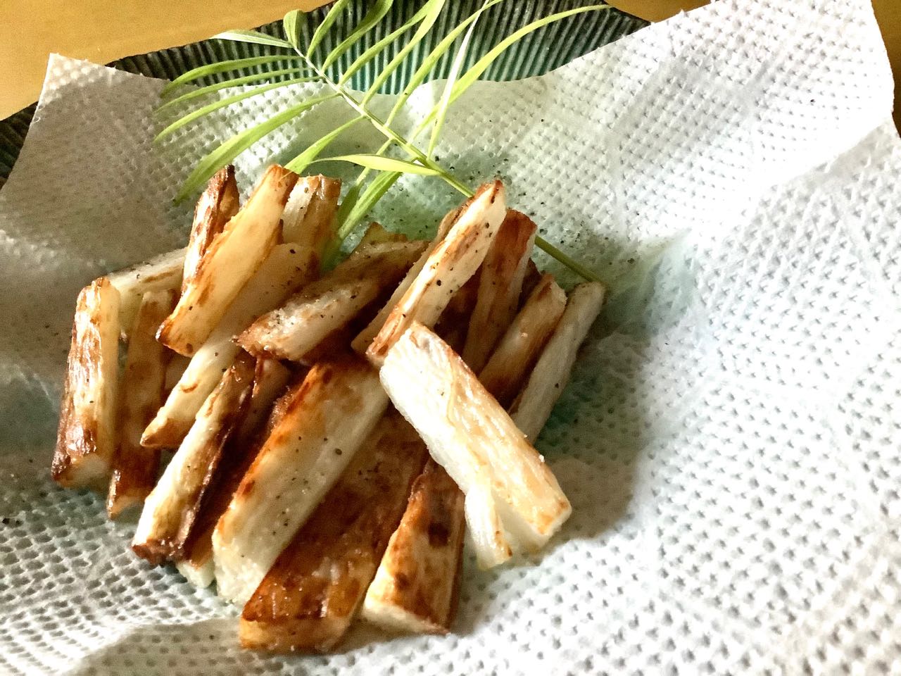 5日.韮崎市にお住まいの、お友達の→内藤誠子さん(韮崎市.生活改善推進委員会の会長)から→教えていただいた→山芋料理を作りました、山芋を、ジャガイモの→フライドポテトのように切り、フキンで水気をとって、フライパンに少し.多めの油を入れて、四方を返しながら、焼き色がつくほどに.なったら終了です、お皿によそって→塩.胡椒で食べると.とても美味しい.簡単料理です、ご覧になってください、