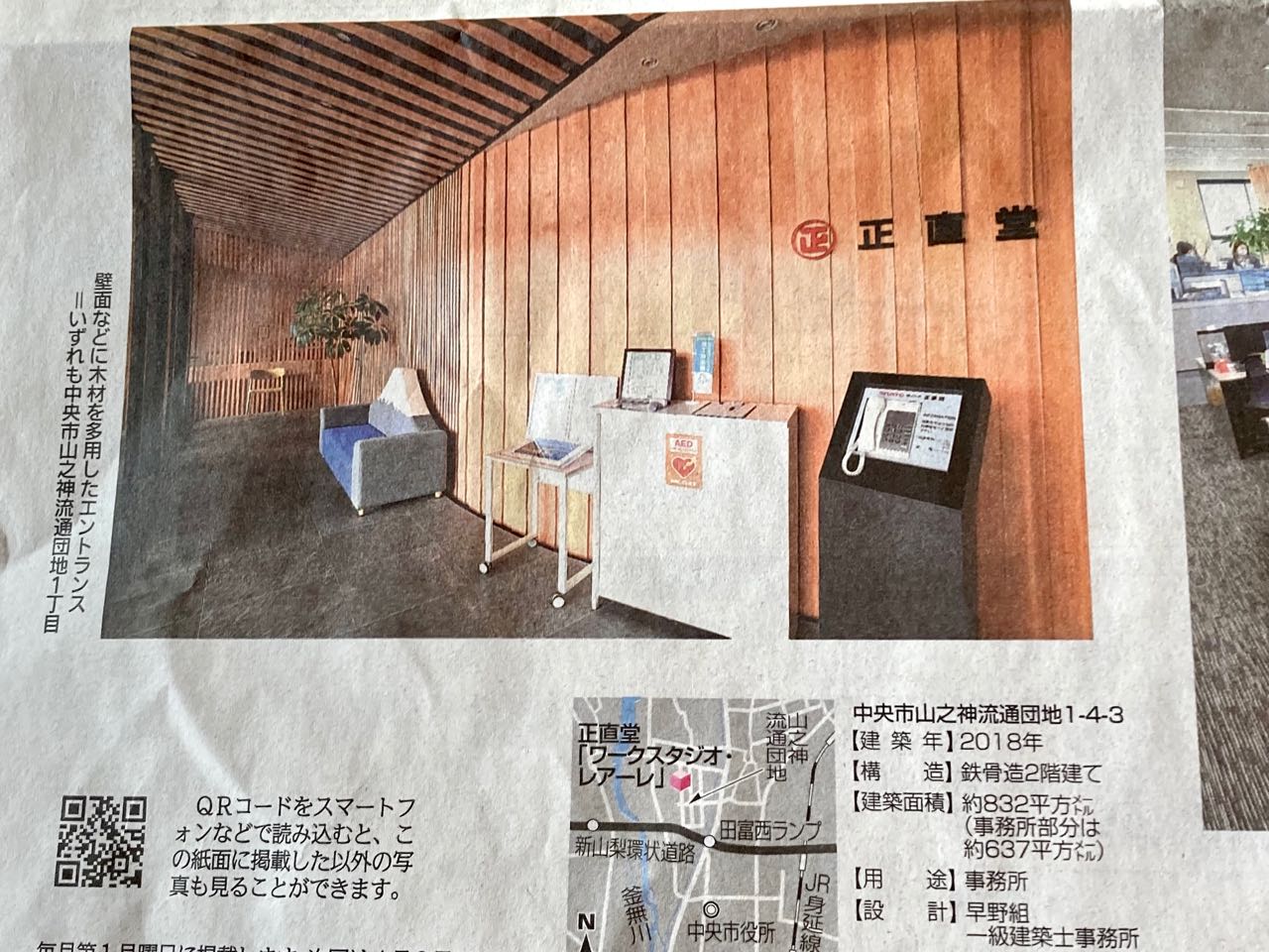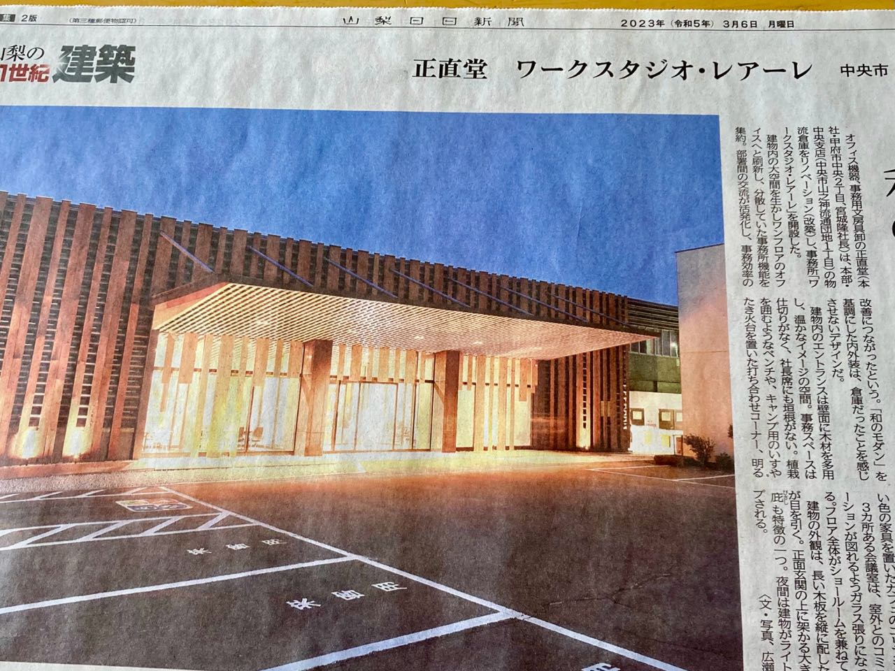 6日.今朝の山日新聞に、創業.明治35年、今年で121年目の→正直堂(社長.宮城隆 さん)..大きく新庁舎が、載っていました、中央市にある、倉庫が変身して、、和のモダンな、正直堂→ワークススタジオ・レアーレが、誕生しました、