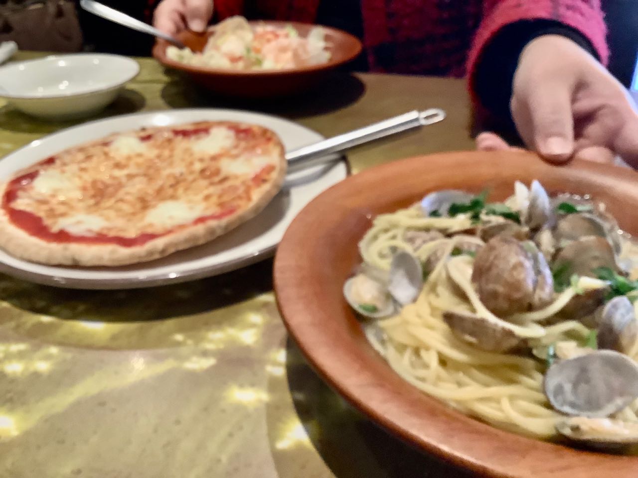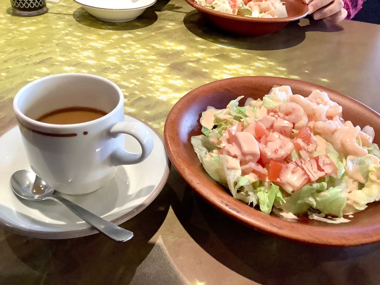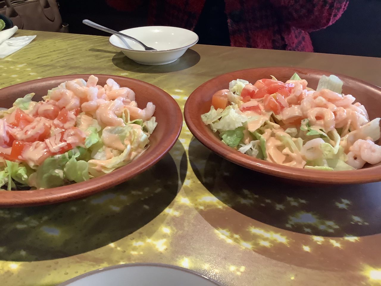 おいしいエビ、サラダと、、ボンゴレバスタをご覧になって下さい、