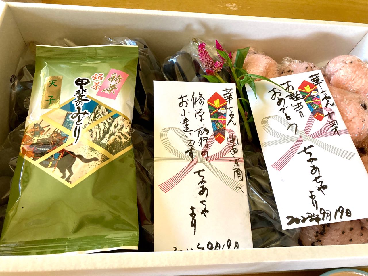 先日9月上旬に.関西方面へ修学旅行に行きましたので、修学旅行の.お小遣いも.入れて置きました..お祝いの封筒の裏には、小さい時からの、楽しい思い出や、これからの未来に向けた、メッセージを、いっぱい.ぎっしりと、書き切れないほど書いて、送りました、ママには、山梨県の、大きなぶどう、ピオーネ」を、たくさんと、「新茶」を.1本入れて.プレゼントです。今朝1番で8時20分までに.クロネコヤマトに、一邦さんか、持ち込みました。今夜18時には、届くと言う事ですので安心です。