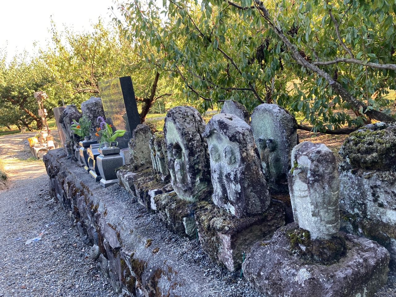 19日.昨日午後から→亡き、両親の墓参りを済ませてから.南アルプス市、飯野、常楽寺の.お寺さんの、山門の前に→眠っている.閻魔大王様の.墓参りも.済ませてきました。 2ヶ月ほど前に.閻魔さんの.御身体に、沢山の→苔(コケ)が.生えていましたが、中込石材屋さんに.頼んで.お彼岸までに、その苔を.お願いして取り除いて、もらいました。昨日は、とてもきれいな、閻魔大王様の、お姿で嬉しくなりました。我が家の庭に咲いている、ダリアの花と.紫の花を添えて、来ました、