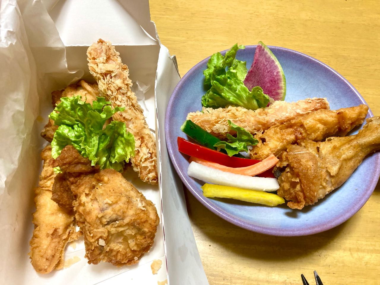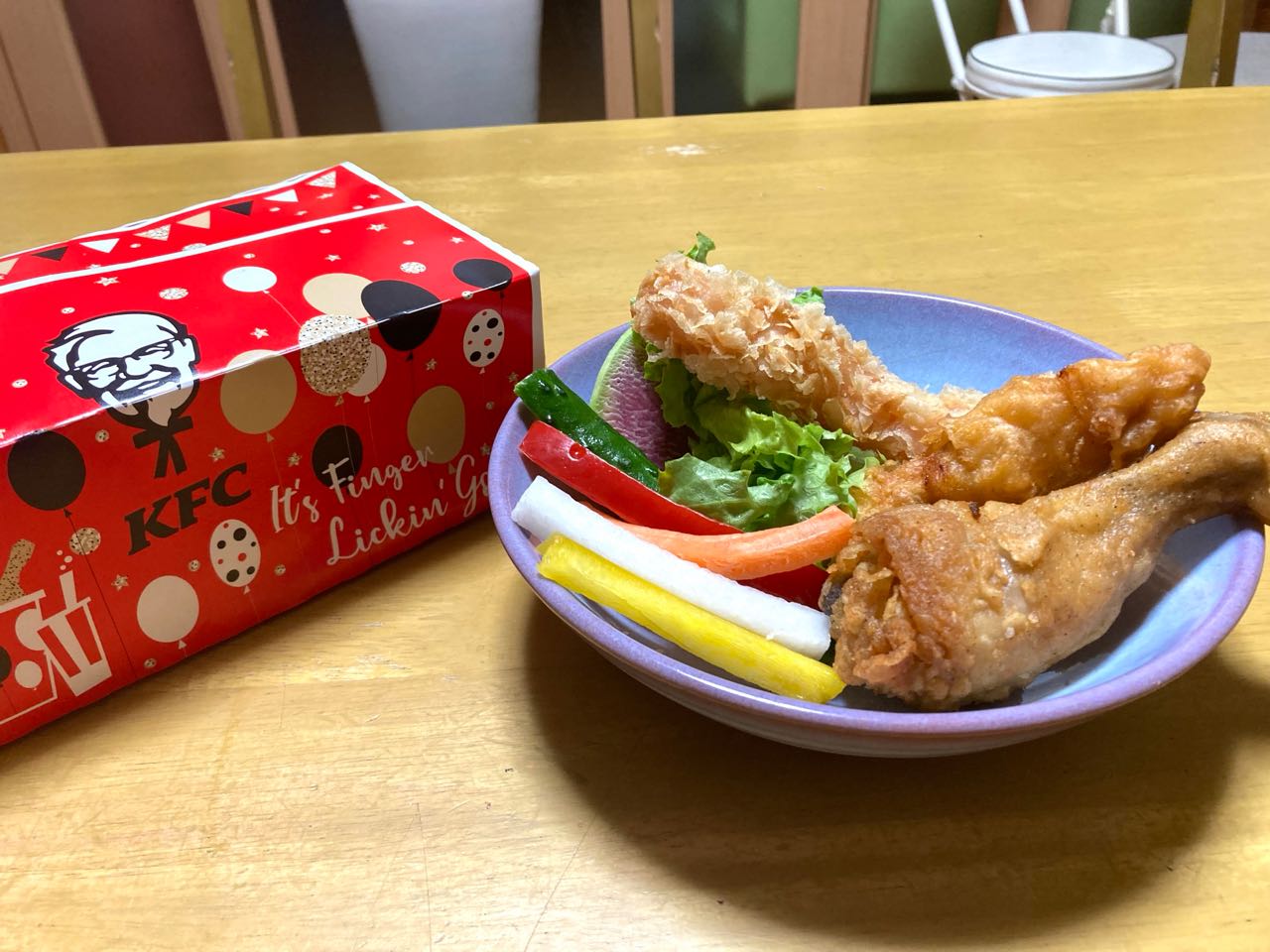 夕飯に→ケンタッキーを、食べました、