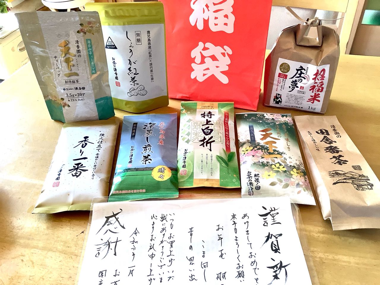 28日.九州の熊本県から→阿蘇山の近くの.霧が深い場所で.栽培している→特別→☆美味しい→☆お茶☆を.7袋→取り寄せました、今回は、1月でお正月として、福袋に入ってきました、熊本県「山鹿市.産」5年連続、日本一の.受賞米、→「森のくまさん」の.お米も、一緒に.送ってくれました、お茶→大好きな、私は、大興奮です、お茶産地の.園主の.心も伝わって来ます、ご覧になって下さい、