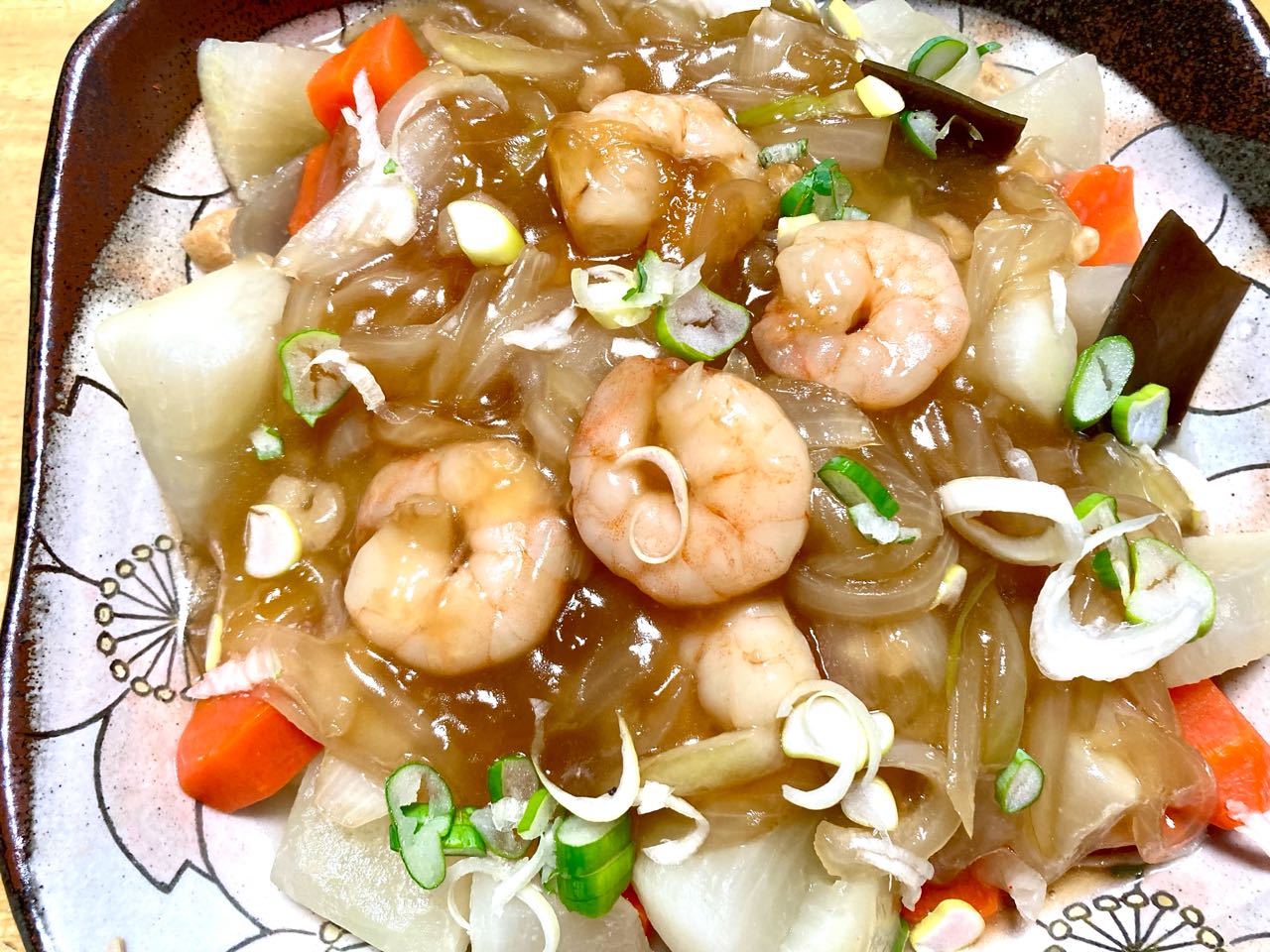 29日.午後から→長い時間をかけて、大根は、面どりをして.人参と.ウドと.コンブを入れて、ゆっくり.うす味で煮て、別の鍋で.大根の上に玉ねぎとエビの、あん掛けを.作っておき、食べる時に、大根の上に.甘酢あんを.掛けました、とっても美味しく出来上がりました、