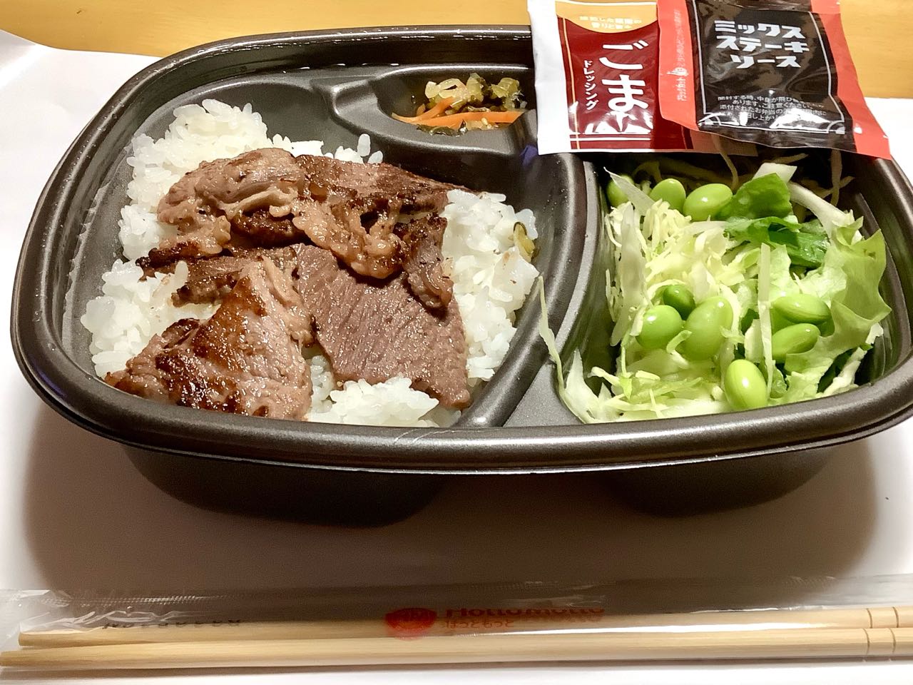 16日.Akikoさん(次女)から、お昼に→1)ステーキ弁当と.2)アボガドの.スライスを.いただきました.とっても美味しそうです、ご覧になってください、