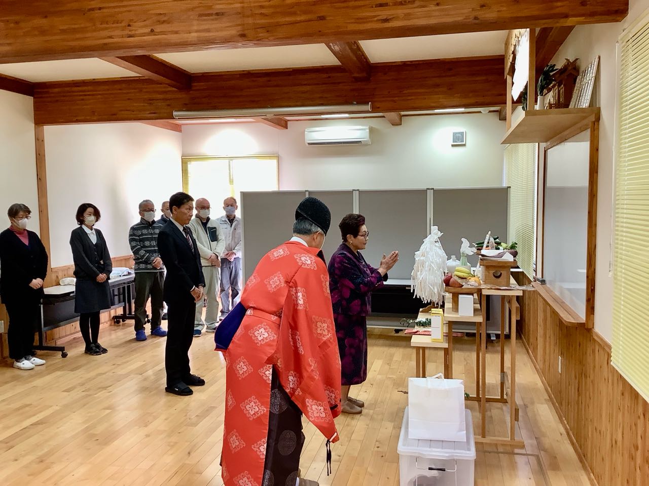 17日.山梨県森林総合コンサルタントでは、午前10時より、甲斐市下今井の、庁舎において、平成6年度の「山の日」→17日に.甲府市穴切神社の.秋山宮司さまを、お願いし、職員全員で「安全祈願祭」を、行いました、写真は.理事長である私が、最初に→玉串を神様に捧げて、次に金子専務が玉串を捧げ→次に、篠原総務部長と職員が全員一緒に、玉串に「安全祈願」を行いました、最後に無事で一年の祈願をした後、御みっき(酒)を、頂きました、ご覧になって下さい、
